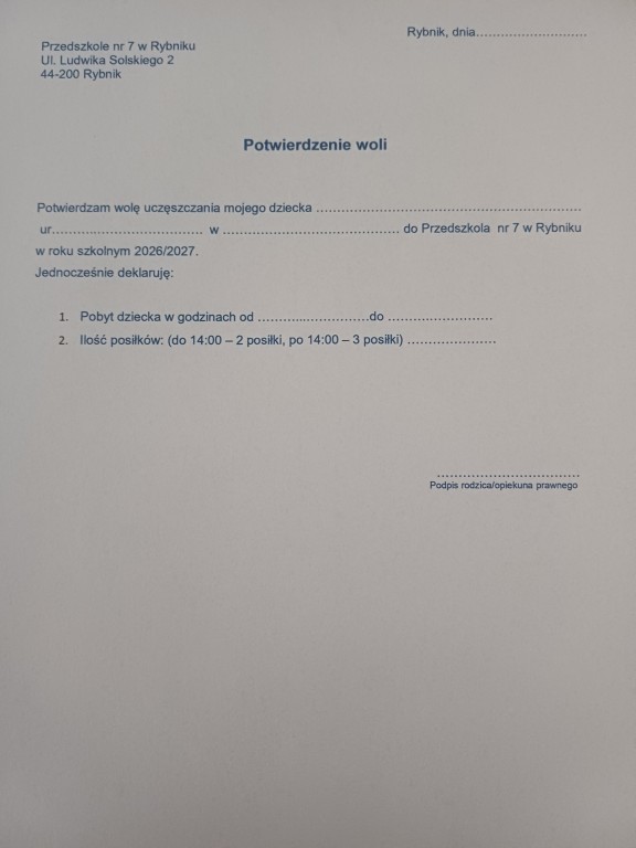 Obowiązkowego potwierdzenia woli przyjęcia dziecka do naszego przedszkola należy dokonać w terminie