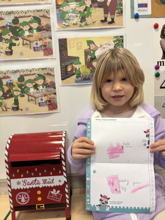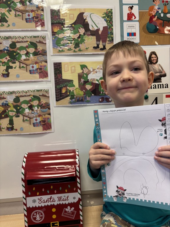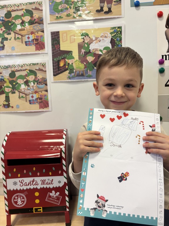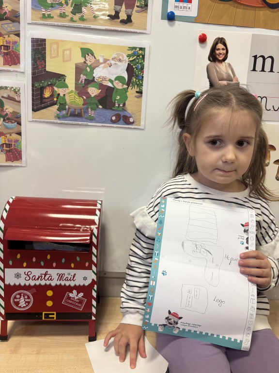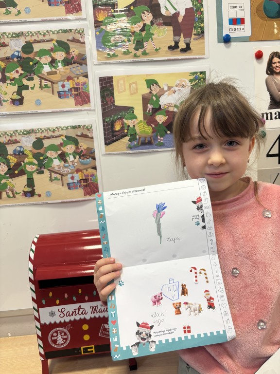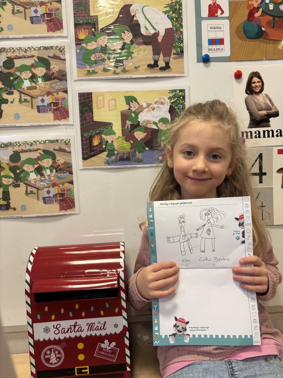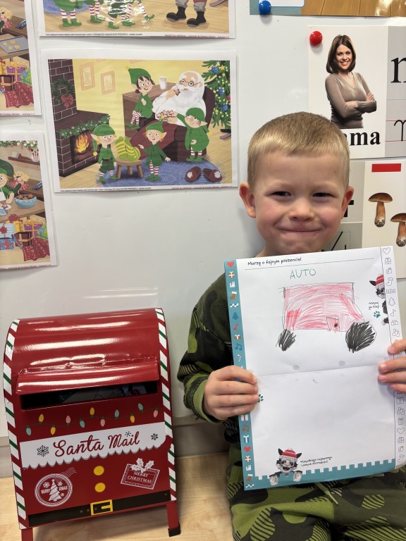 Malowaliśmy swoje wymarzone prezenty, które byśmy chcieli dostać od Mikołaja do domu i od Dzieciątka do naszej sali przedszkolnej. Wrzuciliśmy listy do skrzynki, a kiedy przyszliśmy w czwartek rano do przedszkola, to już listów nie było! Skrzynka była zupełnie pusta!