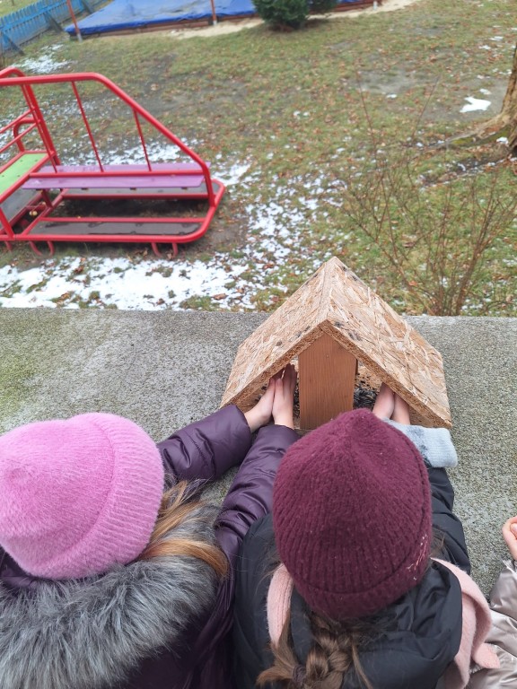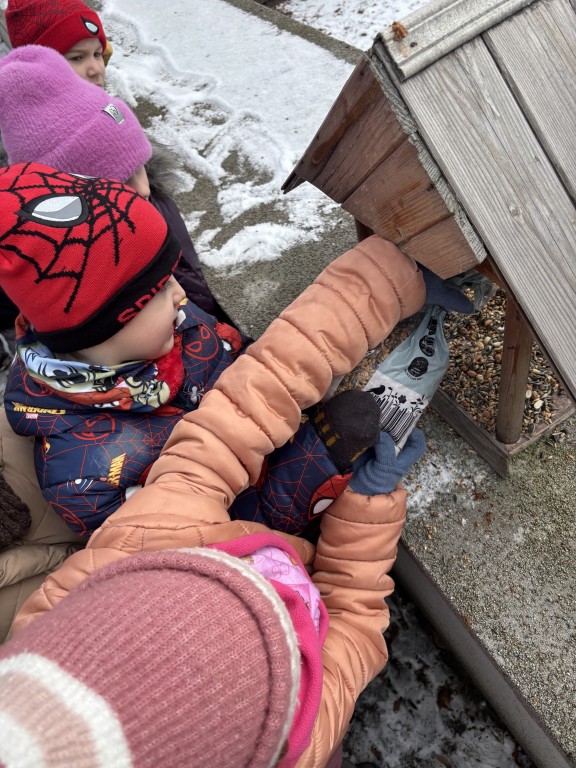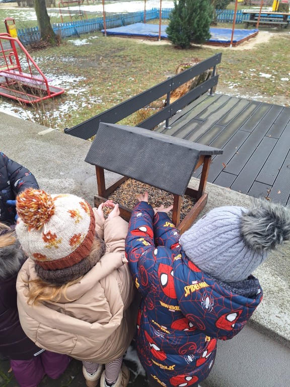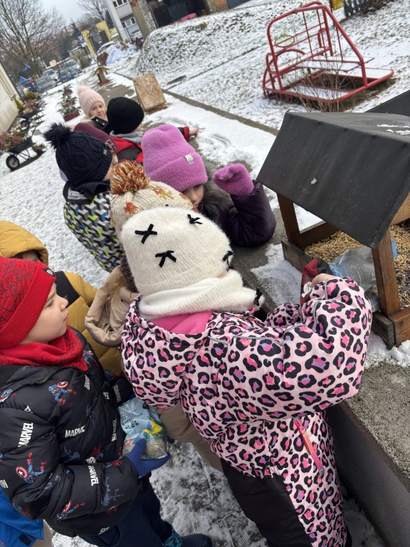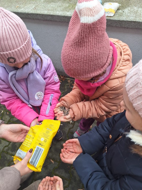 Podczas zajęć dowiedzieliśmy się, jakie ptaki zostają na zimę w Polsce oraz co można wsypać do karmnika. Wiemy, że ptaki nie mogą jeść chleba! Przynieśliśmy słonecznik, mieszanki ziaren i wyszliśmy do naszego ogrodu, aby napełnić karmniki.