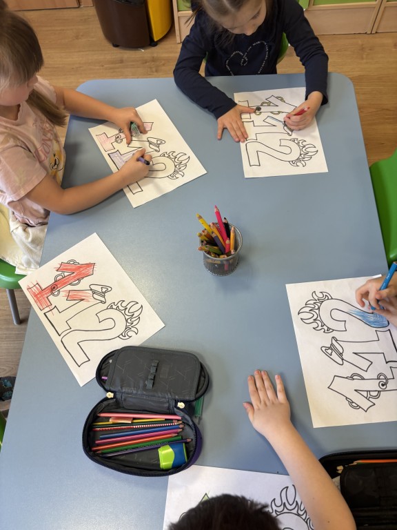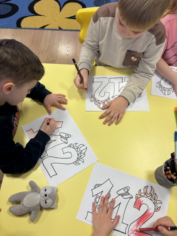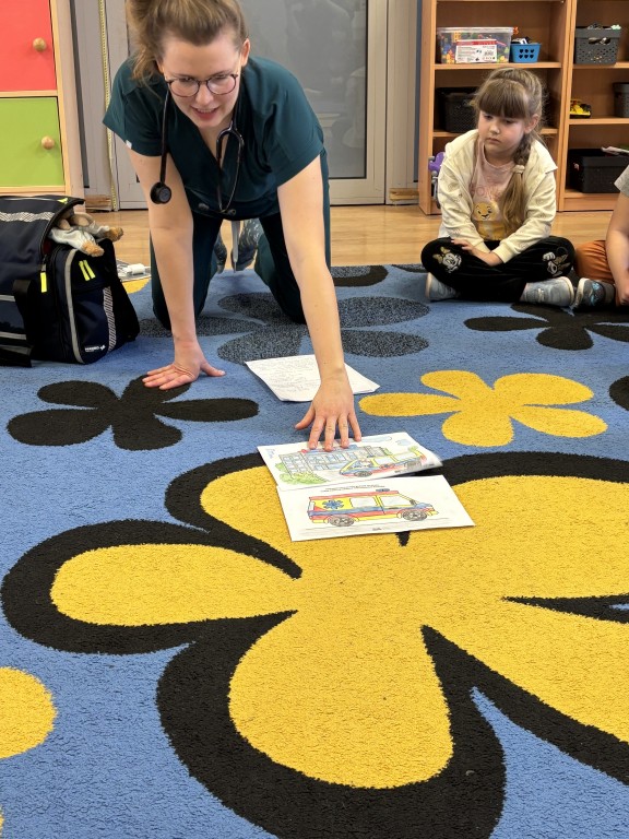 Pani doktor przypomniała, nam jak wzywać pomoc, gdy jesteśmy w niebezpieczeństwie lub gdy nasi bliscy potrzebują pilnie lekarz. Nauczyliśmy się gestu na pomoc. Z uwagą słuchaliśmy informacji o pracy w szpitalu. Pani lekarka pokazała nam strzykawki, którymi możemy robić zastrzyki naszym lalkom i misiom. A na zakończenie pokolorowaliśmy numer alarmowy, aby lepiej go zapamiętać.