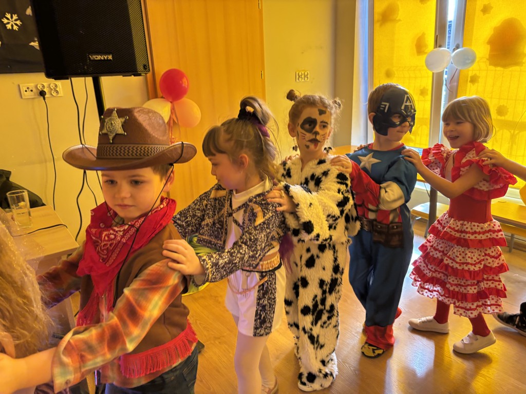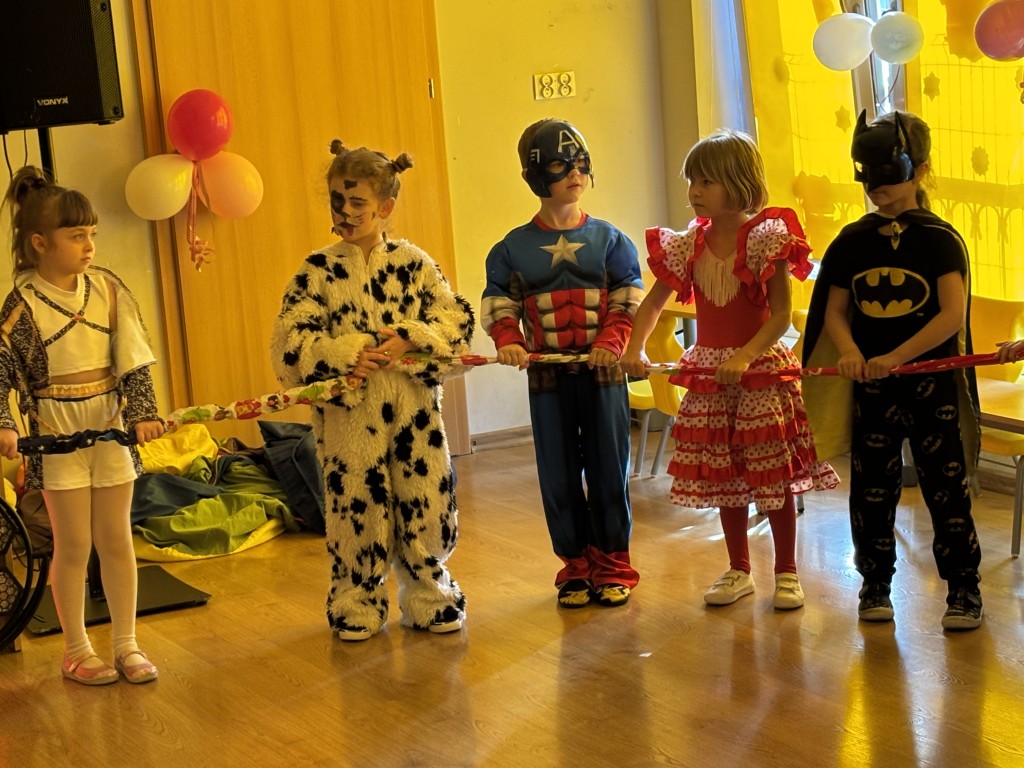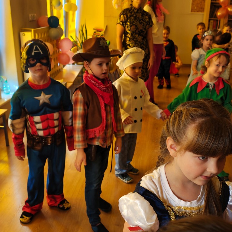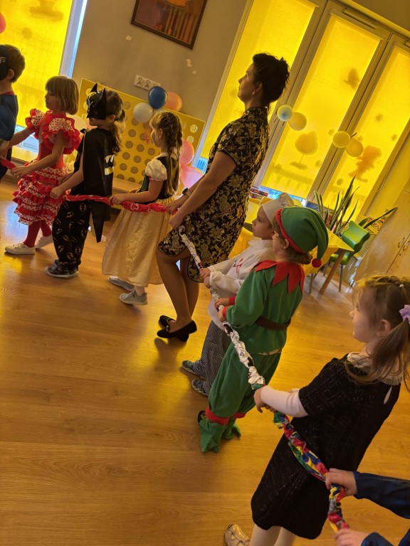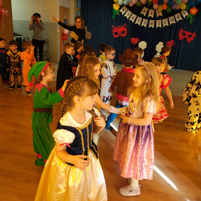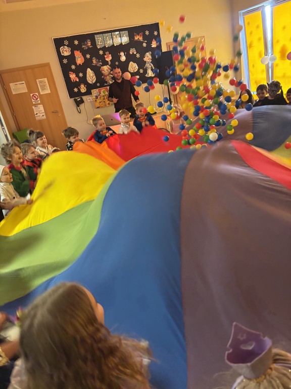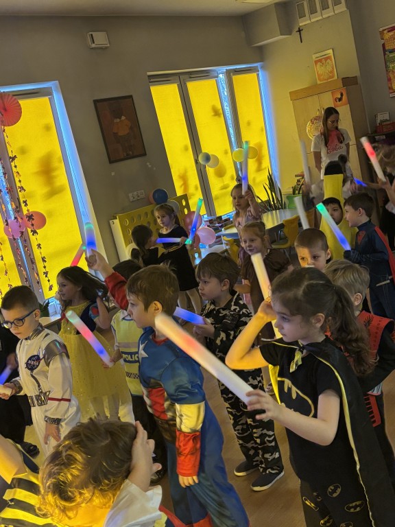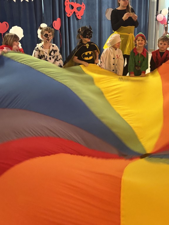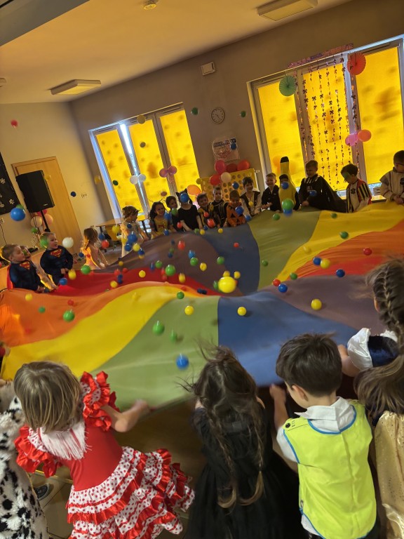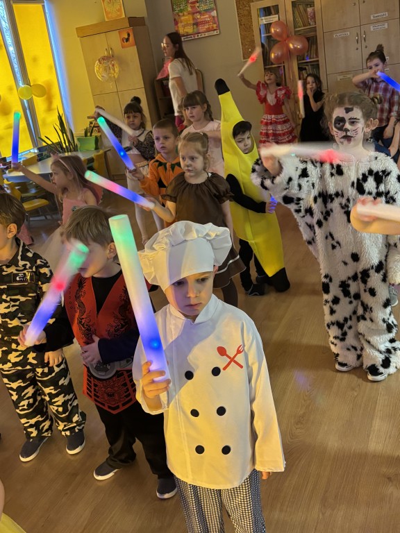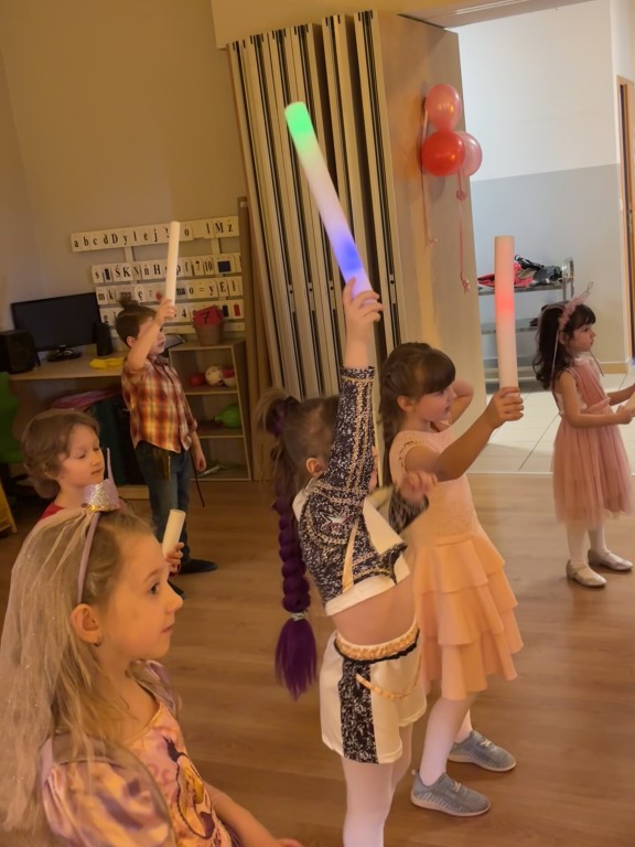Zabawa z DJ Miłoszem była fantastyczna! Tańczyliśmy ze świecącymi pałkami, przechodziliśmy przez linę i tunel, podrzucaliśmy piłeczki na chuście animacyjnej! I dużooo tańczyliśmy, skakaliśmy.