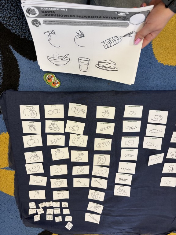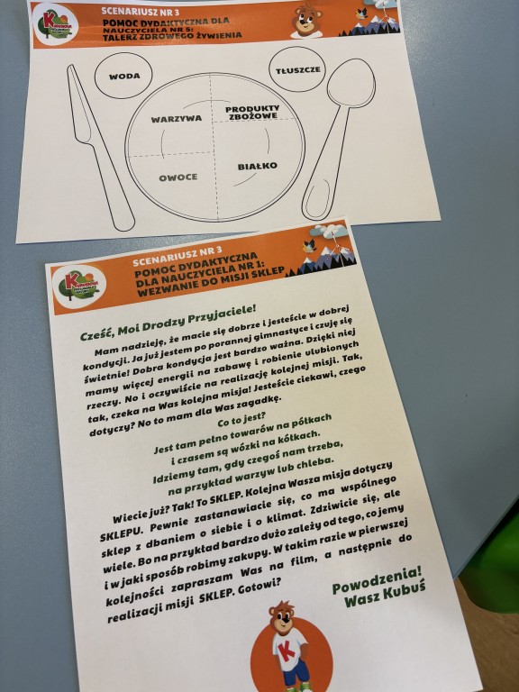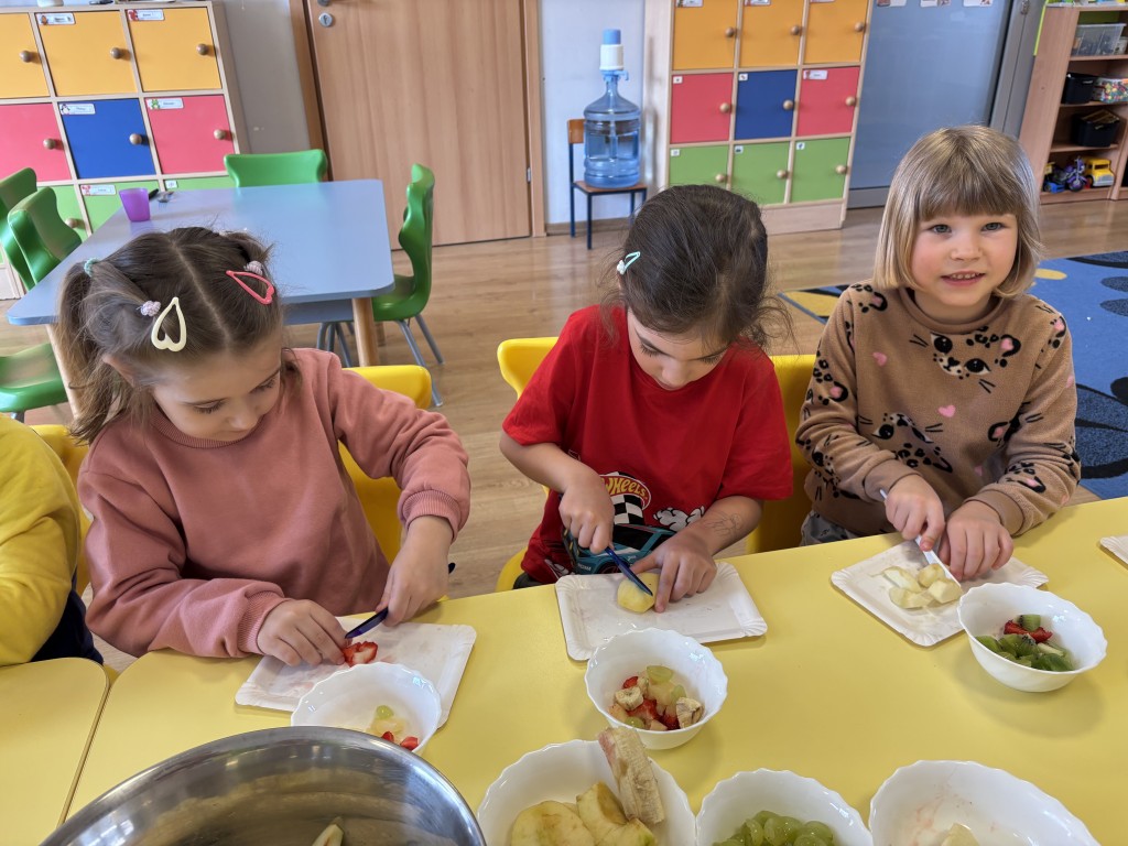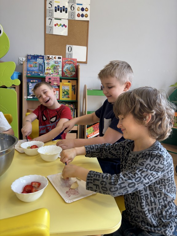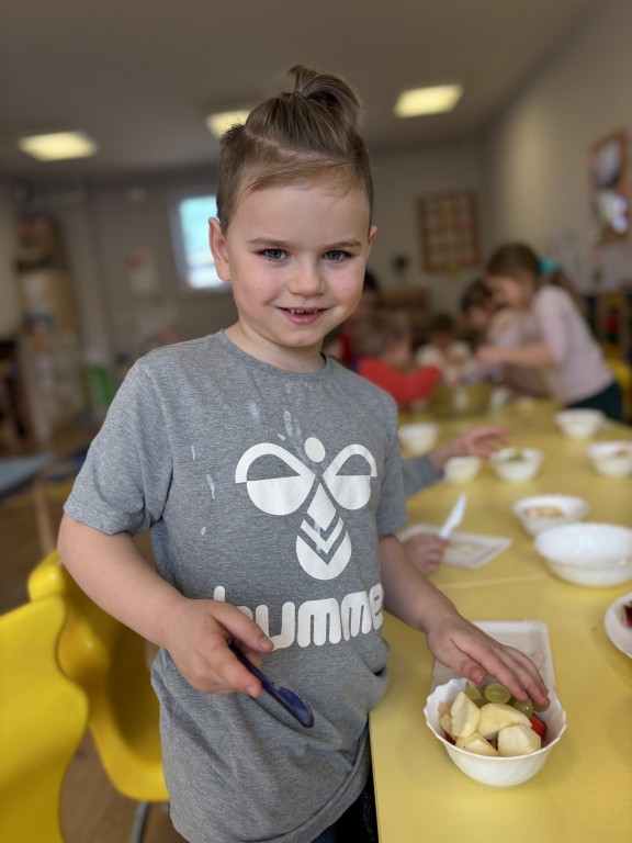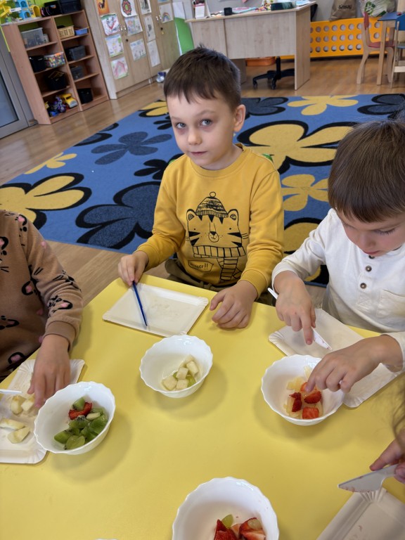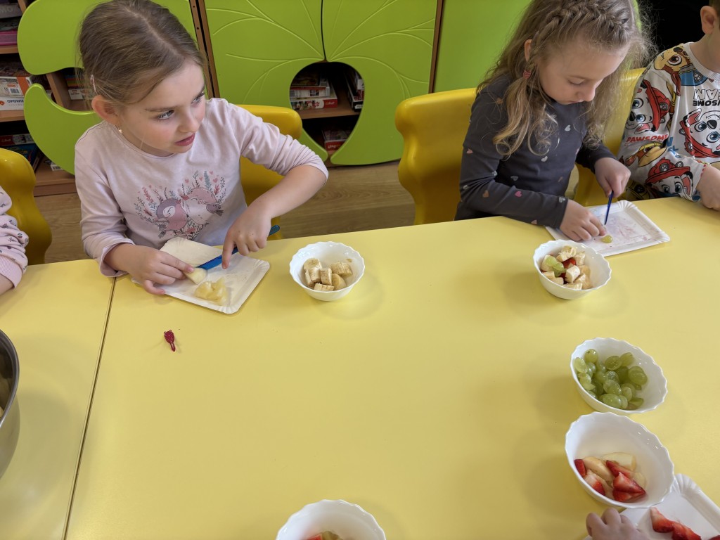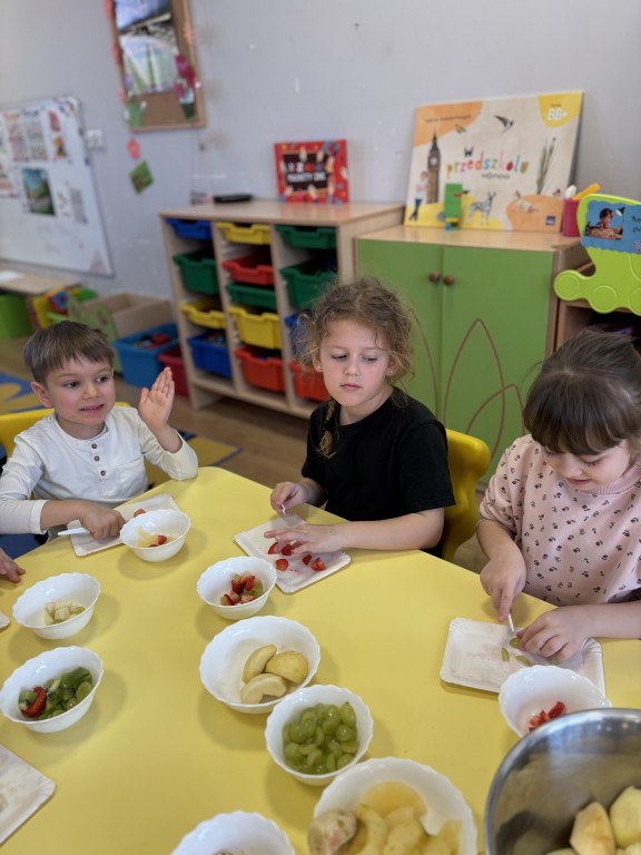 W minionym tygodniu zrealizowaliśmy blok tematyczny Witaminki dla chłopczyka i dziewczynki. Rozmawialiśmy o zdrowym odżywaniu i ruchu oglądając piramidę zdrowego żywienia. Poznaliśmy właściwości niektórych witamin i wiemy jakich produktach występują. Dużo się ruszaliśmy podczas zabaw ruchowych i w ogrodzie przedszkolnym. Wzięliśmy udział w przedszkolnym konkursie o zdrowym żywieniu. A w piątek przynieśliśmy do przedszkola swoje ulubione owoce i zrobiliśmy sałatkę owocową! Przypomnieliśmy zasady bezpieczeństwa i przeszliśmy do pracy - krojenia plastikowymi nożami owocków. Nastepnie skomponowaliśmy swoją sałatkę owocową! Była pyszna:) Jako podsumowanie wiadomości zrealizowaliśmy temat z projektu edukacyjnego Kubusiowi Przyjaciele Natury - Misja sklep.