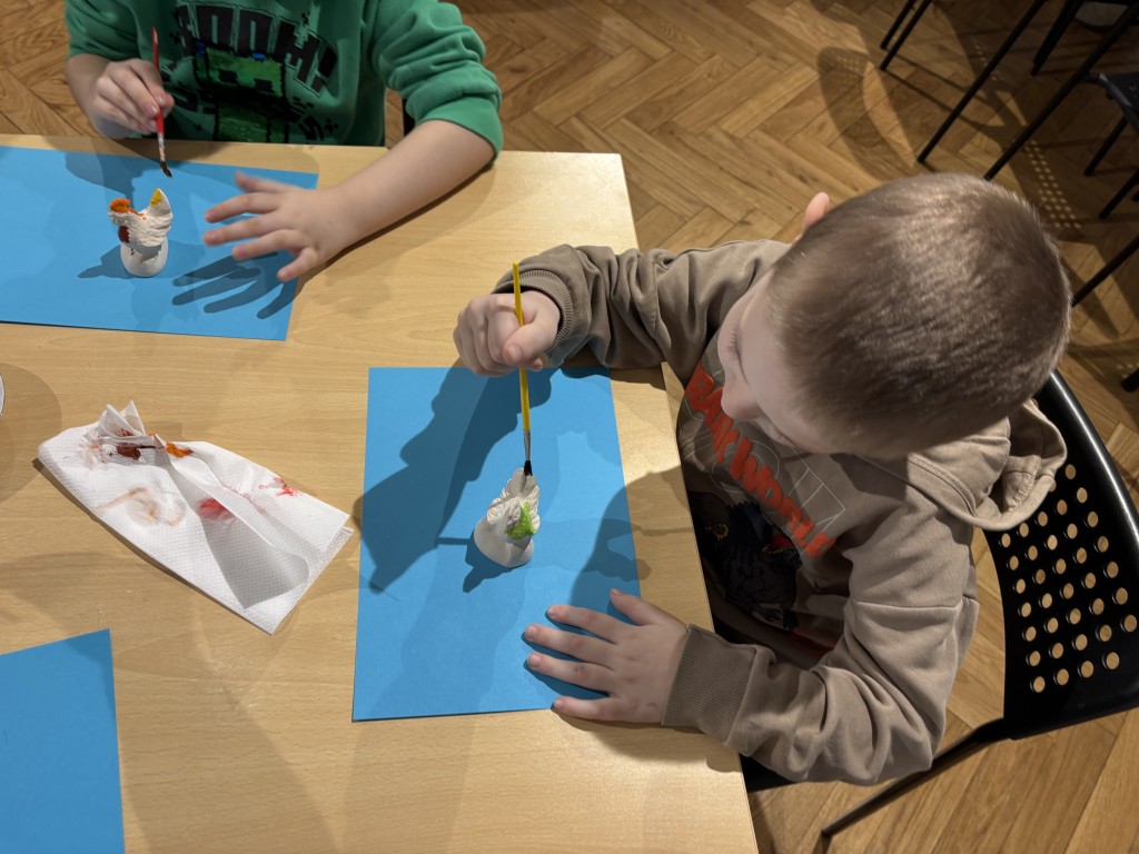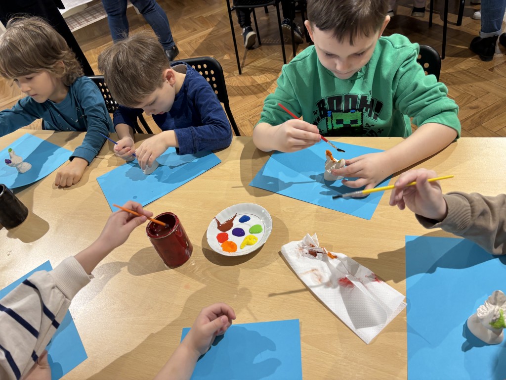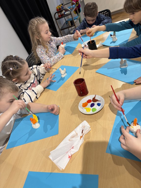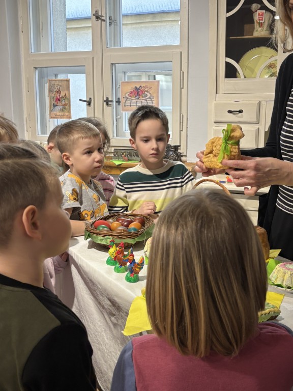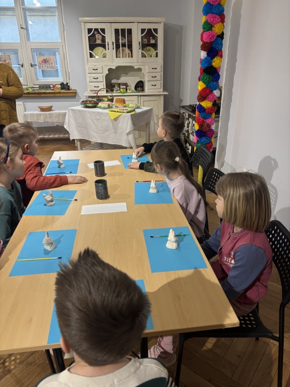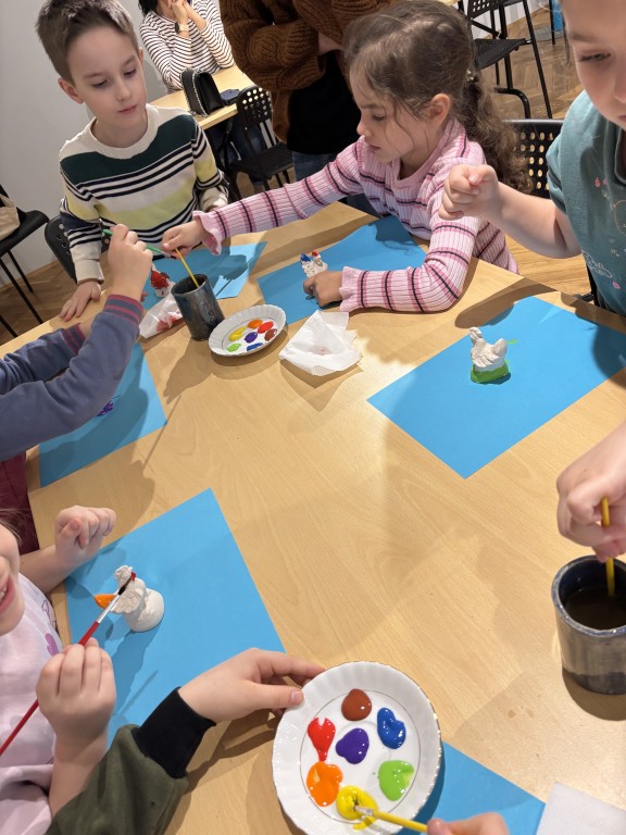 Wzięliśmy udział w warsztatach Kolorowe Święta. Wielkanocne wypieki i formy cukiernicze. Z zaciekawieniem słuchaliśmy historii wypieków wielkanocnych, oglądaliśmy różne formy oraz pięknie ozdobione ciasta. Przypomnieliśmy sobie, co wkładamy do koszyczka wielkanocnego i jak możemy farbować jaja. Pomalowaliśmy ceramiczną kurkę, którą zabraliśmy do domu. A na zakończenie wizyty w muzeum zwiedziliśmy salę z wycinankami, które zrobiły na nas ogromne wrażenie. Nawet były Koguty!