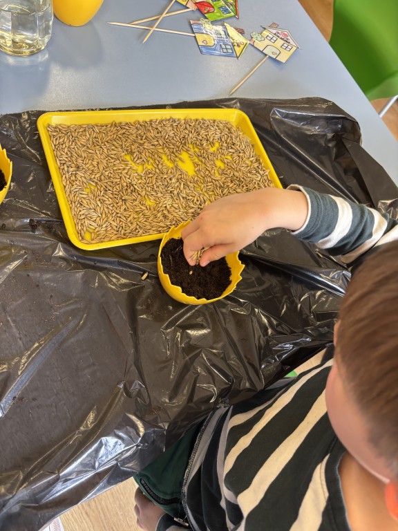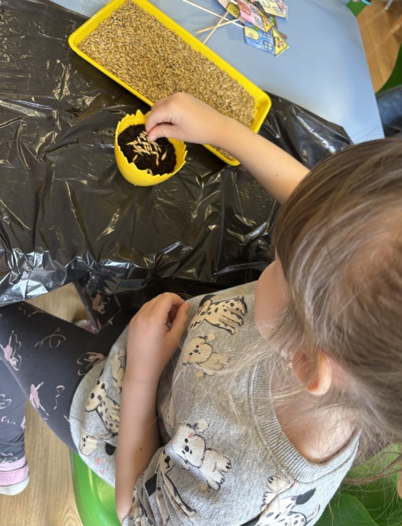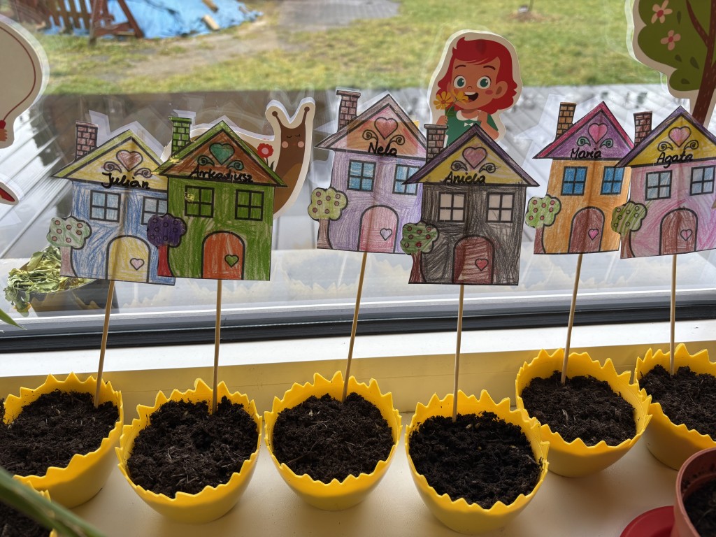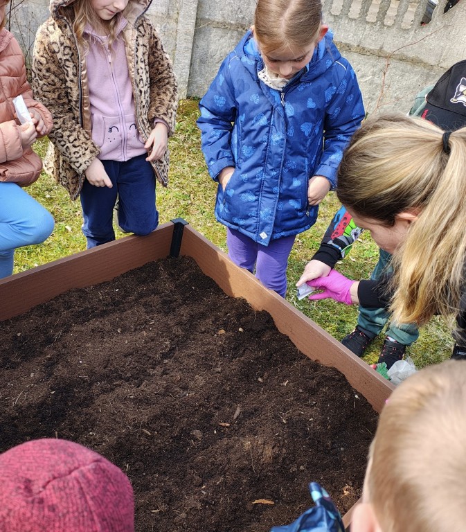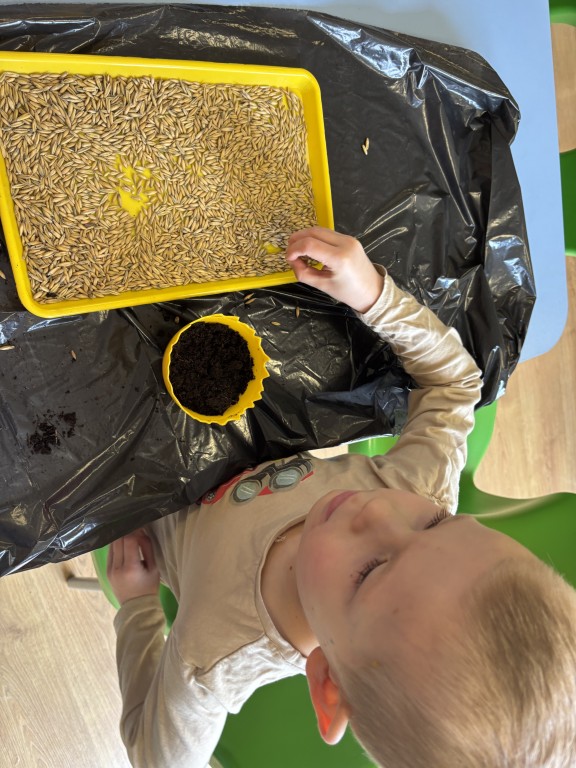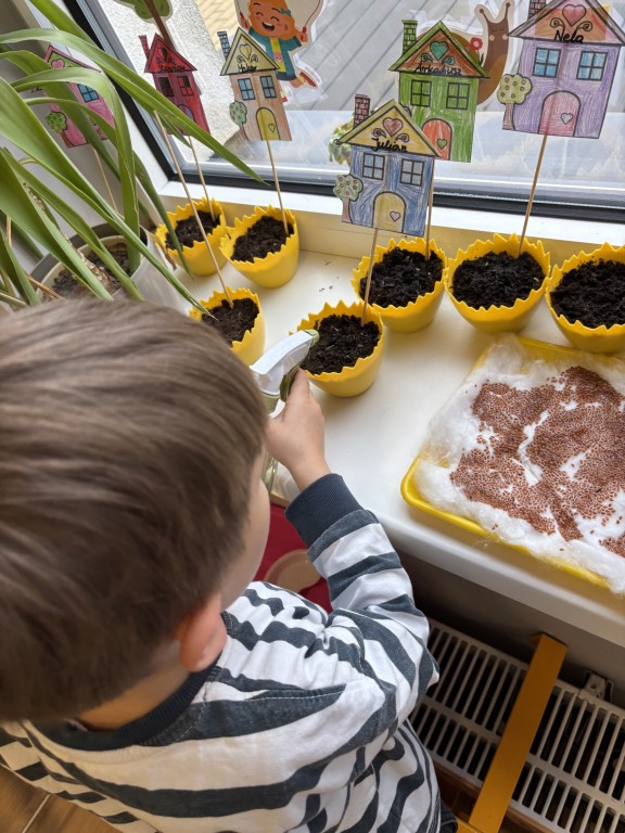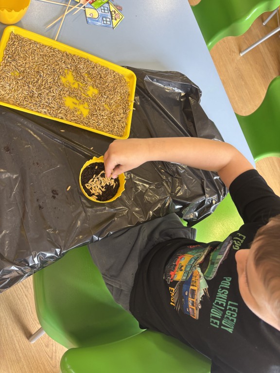 Najpierw zasialiśmy owies. Do przygotowanych doniczek z ziemia wsypywaliśmy ziarenka, zasypywaliśmy ziemią i podlewaliśmy. Następnie posialiśmy w naszym ogrodzie przedszkolnym warzywa. Zrobilismy też doświadczenie z fasolą. A podczas zajęć omawialiśmy cykl wzrostu między innymi kukurydzy i pomidorów. Wspólne działania rozbudziły w nas chęć odkrywania przyrody!