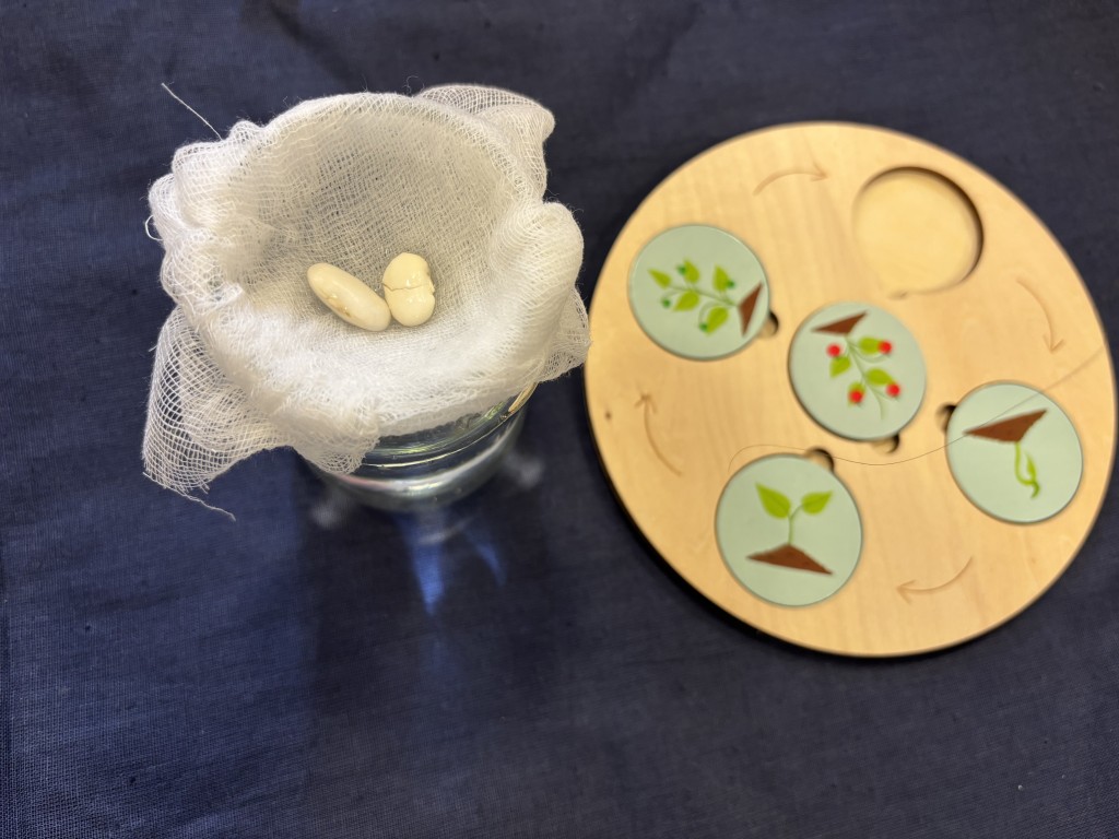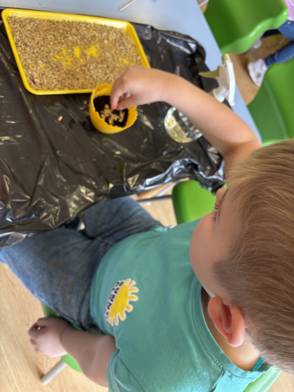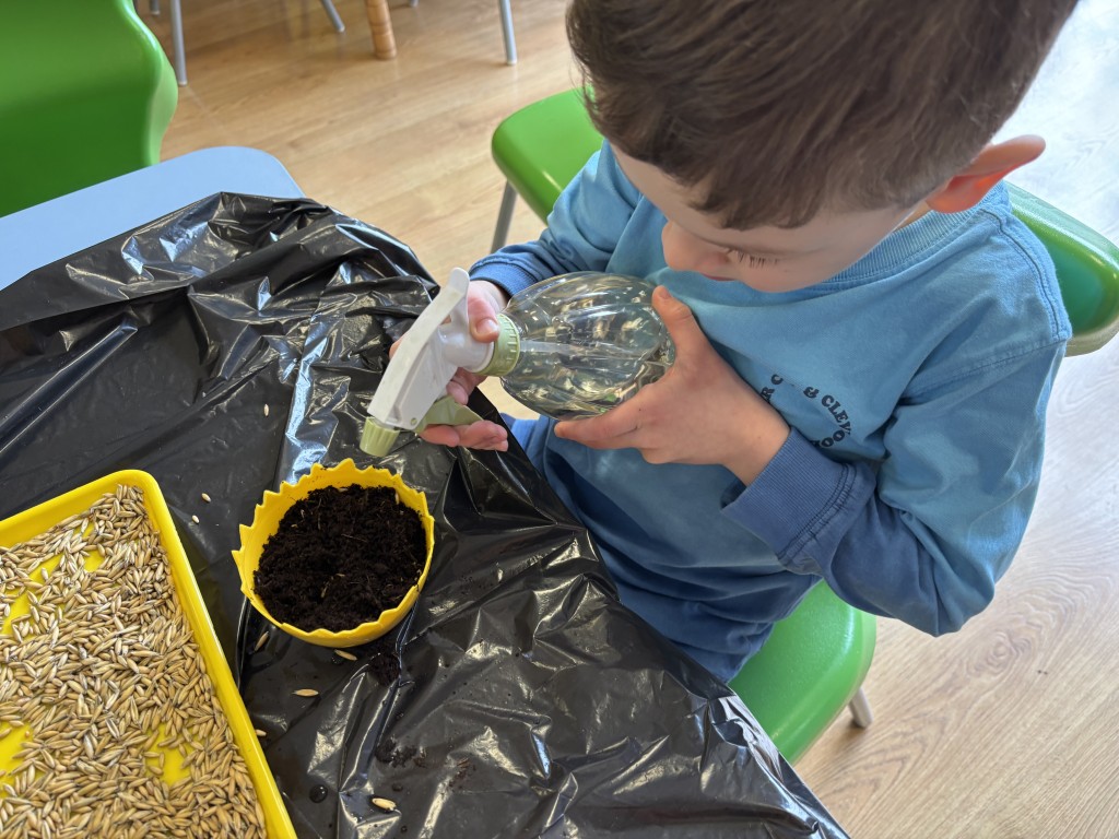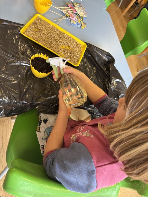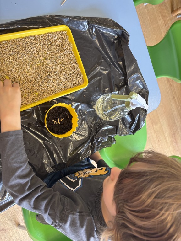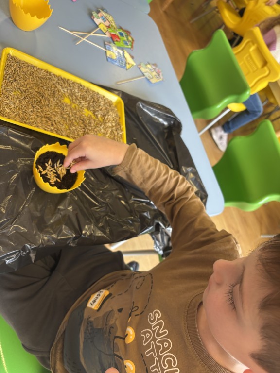 Najpierw zasialiśmy owies. Do przygotowanych doniczek z ziemia wsypywaliśmy ziarenka, zasypywaliśmy ziemią i podlewaliśmy. Następnie posialiśmy w naszym ogrodzie przedszkolnym warzywa. Zrobilismy też doświadczenie z fasolą. A podczas zajęć omawialiśmy cykl wzrostu między innymi kukurydzy i pomidorów. Wspólne działania rozbudziły w nas chęć odkrywania przyrody!