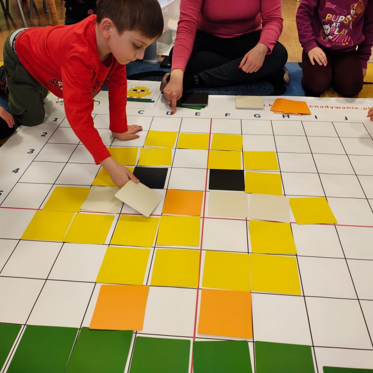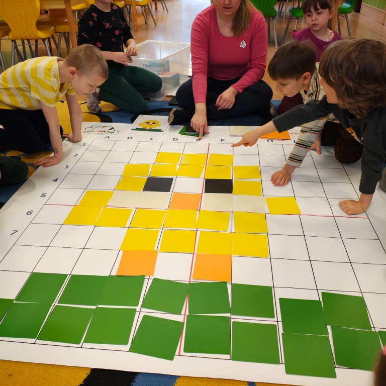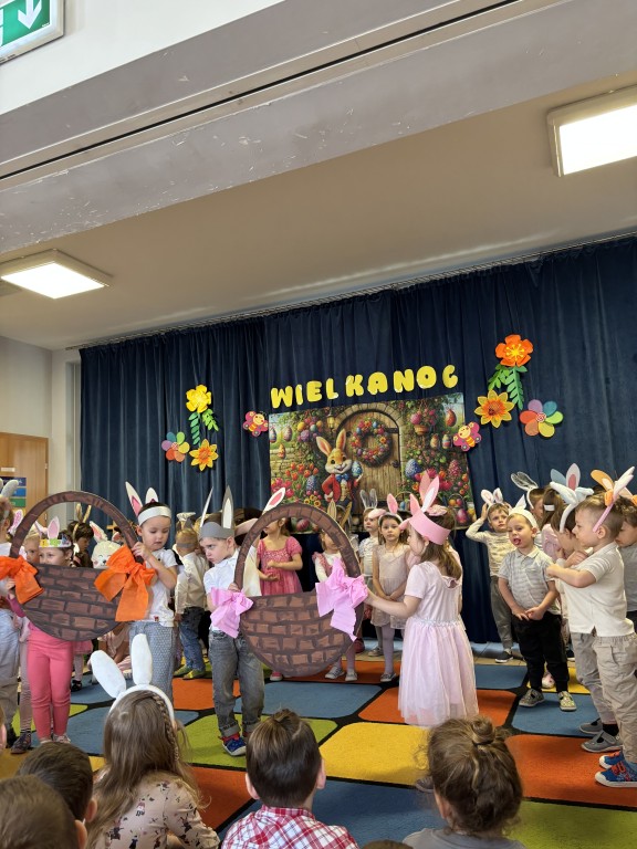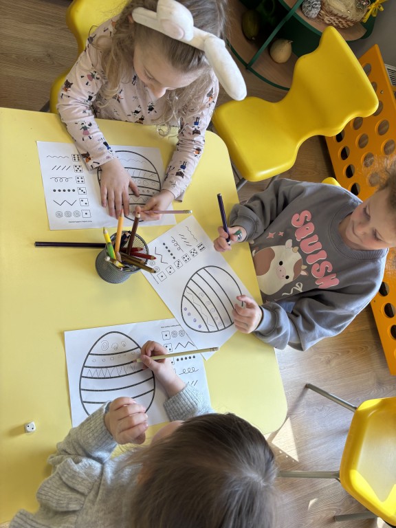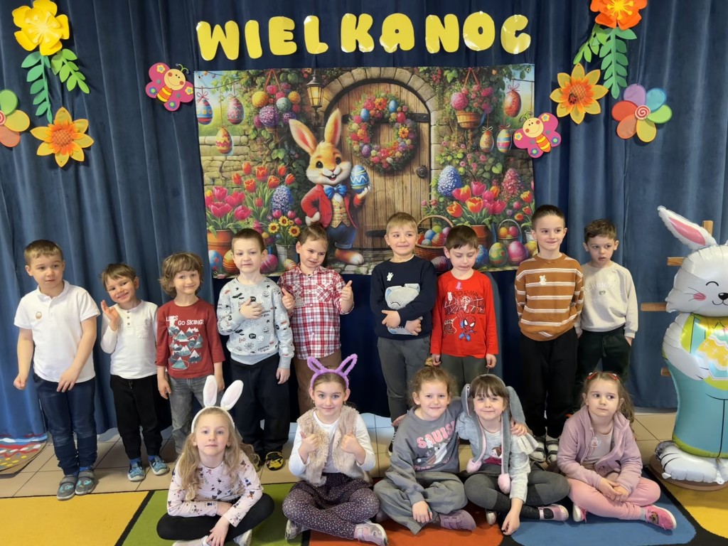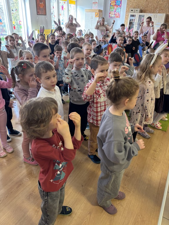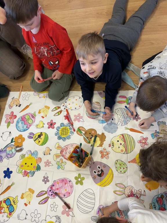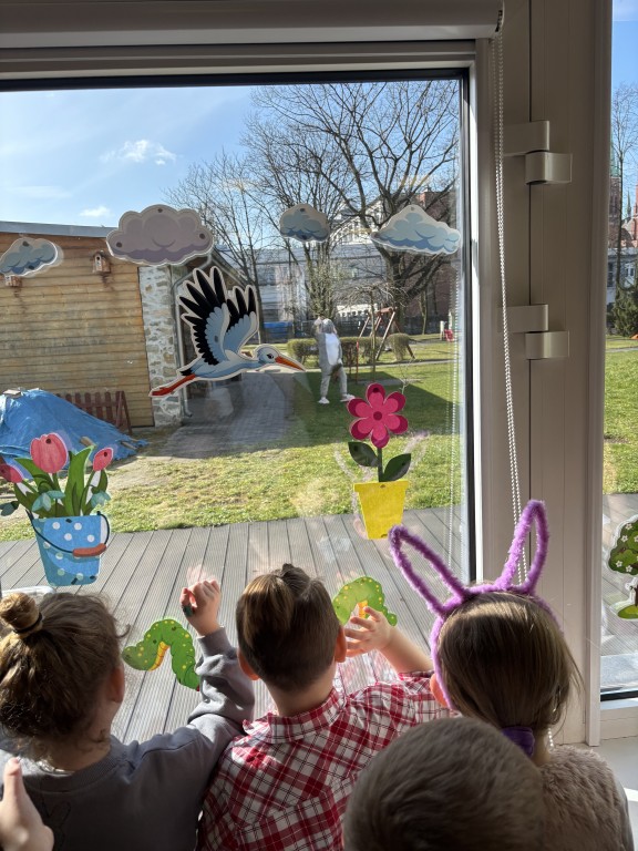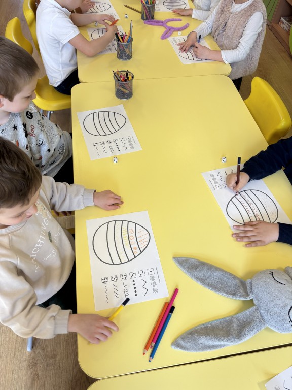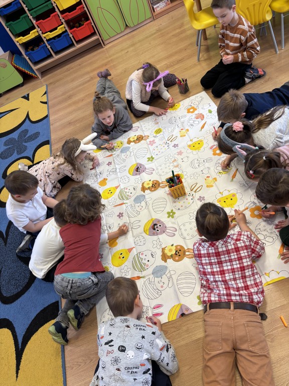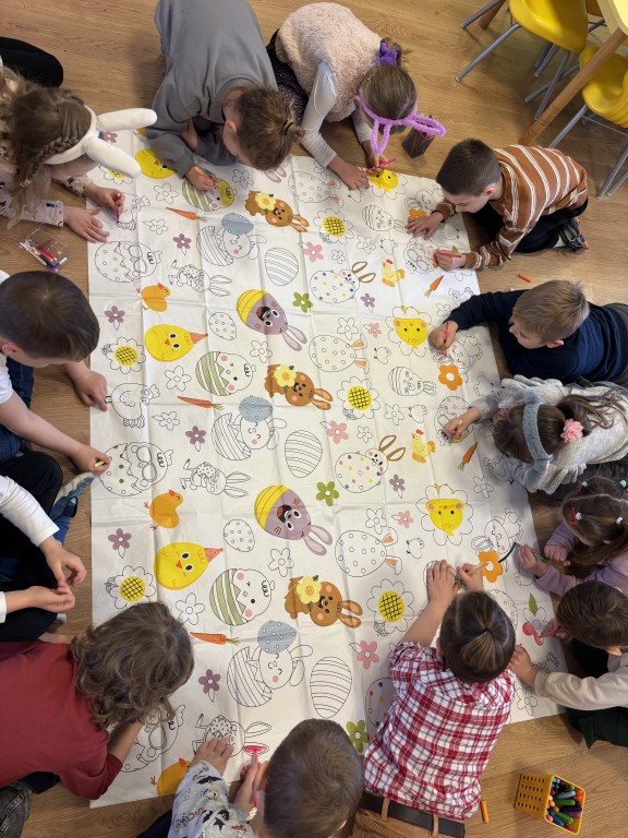 W środę zjedliśmy śniadanie wielkanocne i wspólnie kolorowaliśmy ogromny obrazek, który dekoruje naszą salę. Następnie aktywnie braliśmy udział w występie dzieci z grupy Pajacyków i Piesków. Po przedstawieniu jedząc drugie śniadanie zauważyliśmy w naszym ogrodzie gościa! Był to zając wielkanocny, który zostawił dla nas ogromne jajka niespodzianki w ogrodzie! Popołudniu podczas zabaw matematycznych dostaliśmy kostki i to one decydowały o wzorach na naszych papierowych pisankach!
