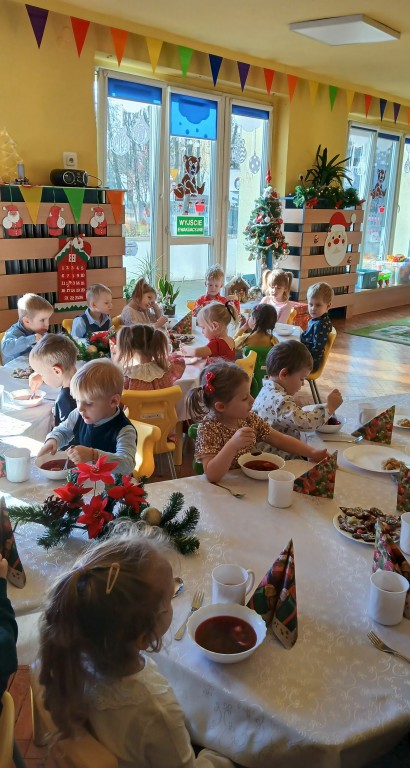 Święta Bożego Narodzenia to magiczny czas.W naszym przedszkolu ten czas oczekiwania zakończyliśmy wspólną Wigilijką, która odbyła się 17 grudnia. Codzienny obiad zamienił się w świąteczną uroczystość. Była choinka z zapalonymi lampkami, stroiki, obrusy a w tle grała cichutko nastrojowa muzyka.