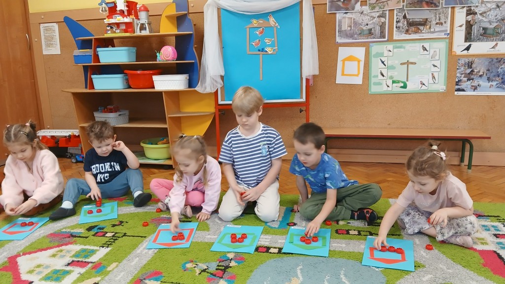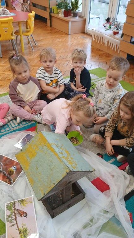 Realizując tematykę o dokarmianiu ptaków uczestniczyliśmy w całym cyklu działań edukacyjnych m.in. słuchaliśmy wierszy, opowiadań, oglądaliśmy filmiki edukacyjne oraz poznaliśmy wybrane ptaki zimujące w Polsce. Uczestniczyliśmy w zabawach ruchowych, muzycznych, konstrukcyjnych i matematycznych, a na zajęciach plastycznych wykonaliśmy sikorki w karmnikach.