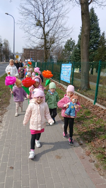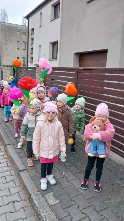 Podczas marszu śpiewaliśmy wiosenne piosenki, dzięki którym nasz korowód nie pozostał niezauważony. Wszyscy przechodnie uśmiechem reagowali na widok tak barwnej i roześmianej gromady dzieci.