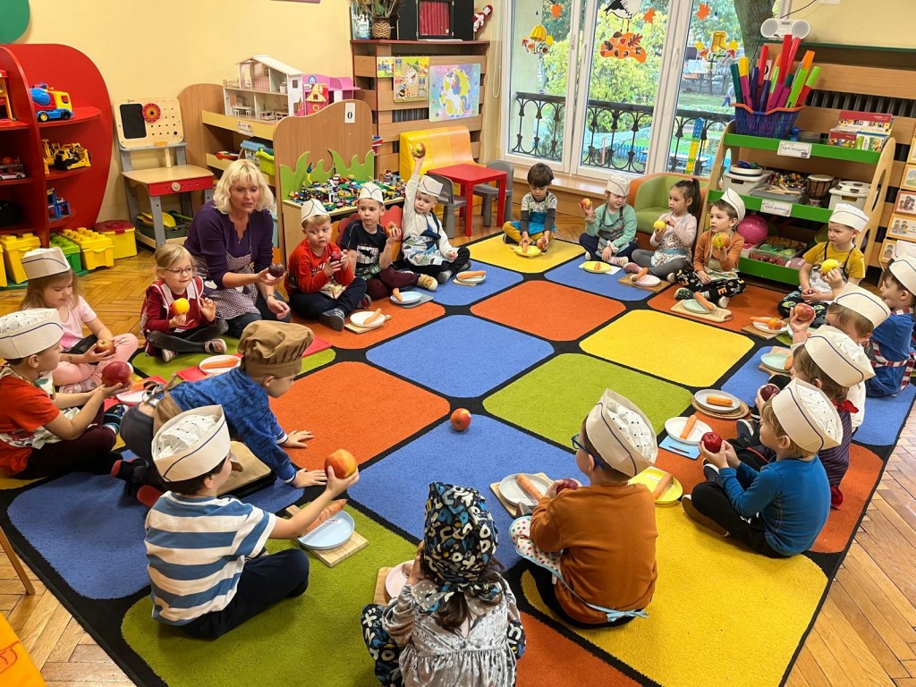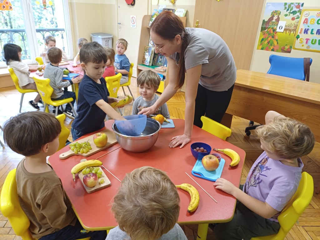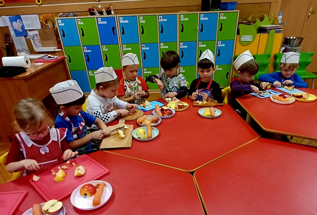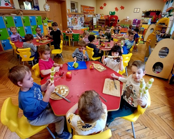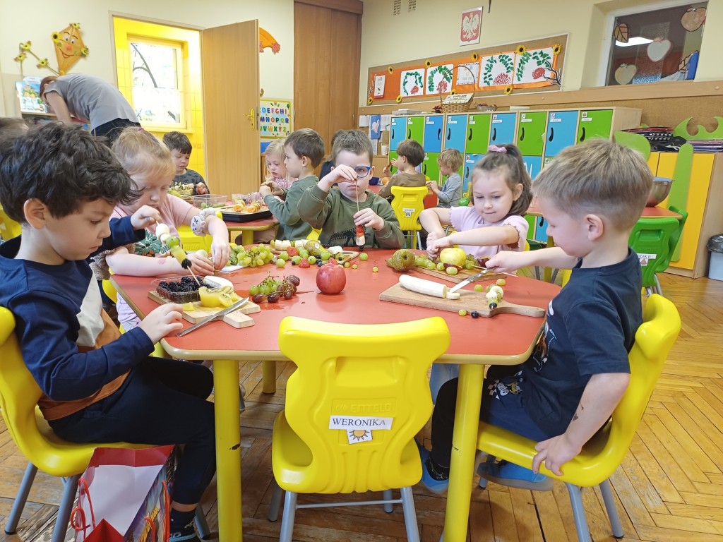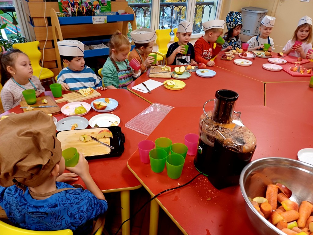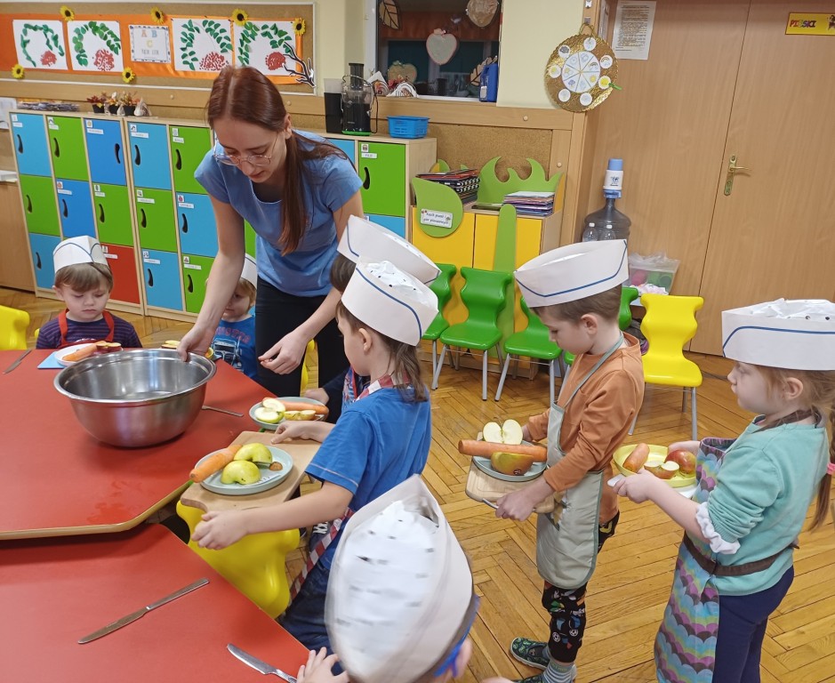 Wiemy, że owoce i warzywa są bardzo zdrowe i zawierają witaminy. Właśnie dlatego postanowiliśmy zrobić sok jabłkowo- marchwiowy oraz owocowe szaszłyki! Wszystkie potrzebne produkty oraz deski do krojenia i fartuszki przynieśliśmy z domu a z niewielką pomocą naszych Pań soczek i owocowy szaszłyk udał się nam doskonale - był bardzo zdrowy oraz smaczny!