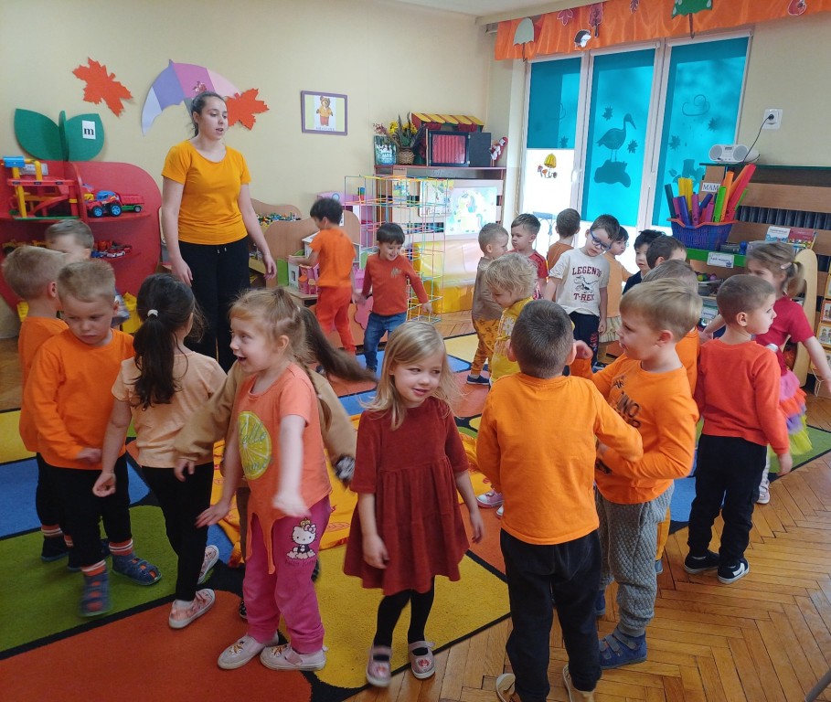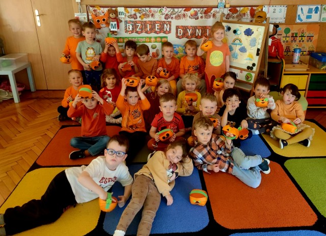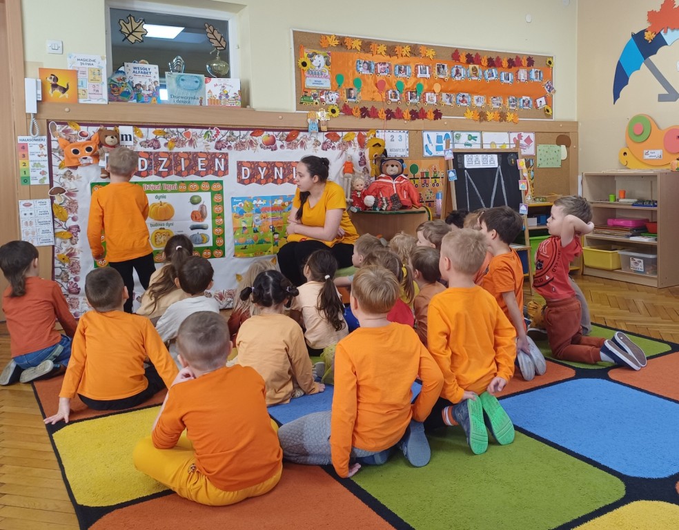 31 października w naszej grupie zrobiło się pomarańczowo! Dzieci ubrały koszulki w pięknym dyniowym kolorze a na naszej tablicy i w całej sali rozgościły się DYNIE!