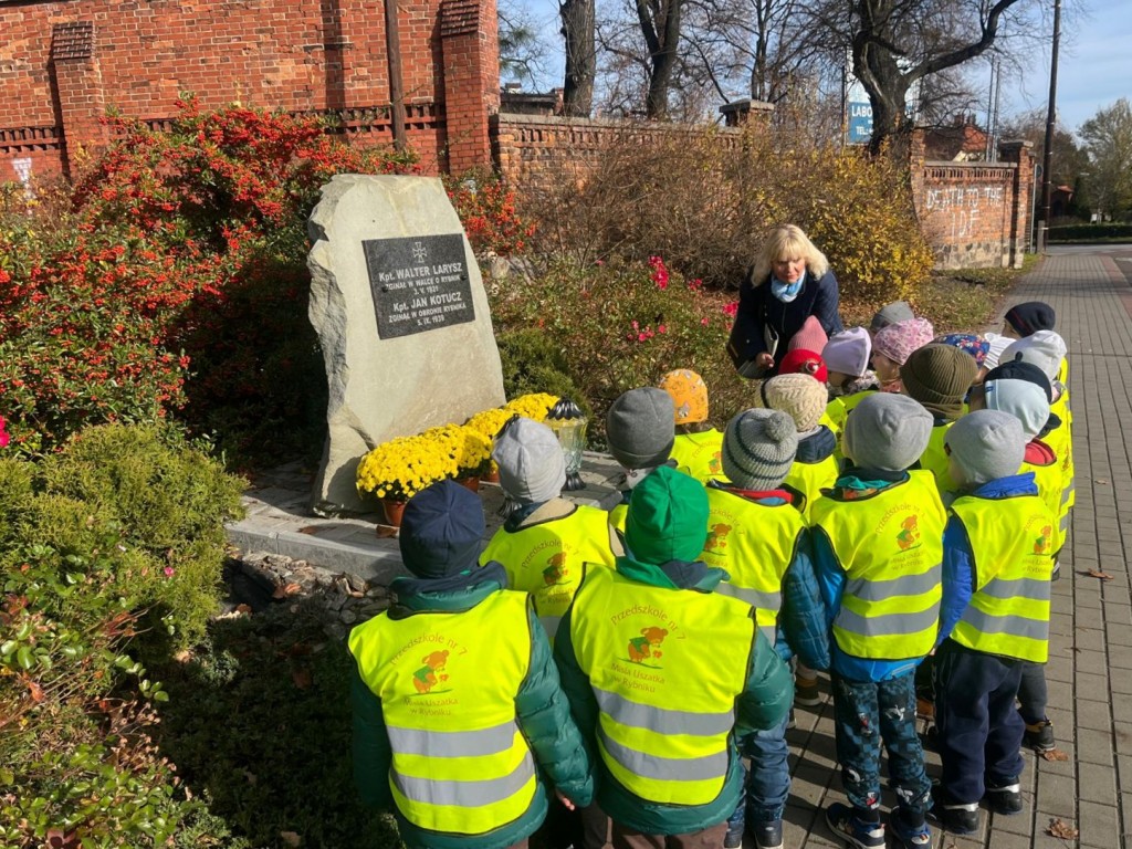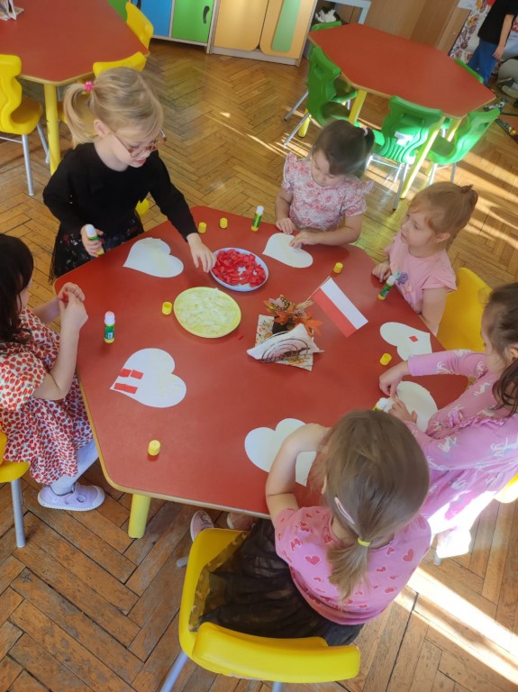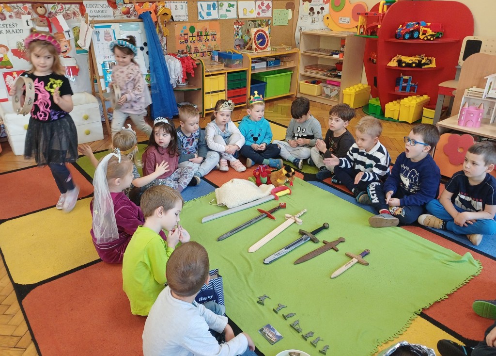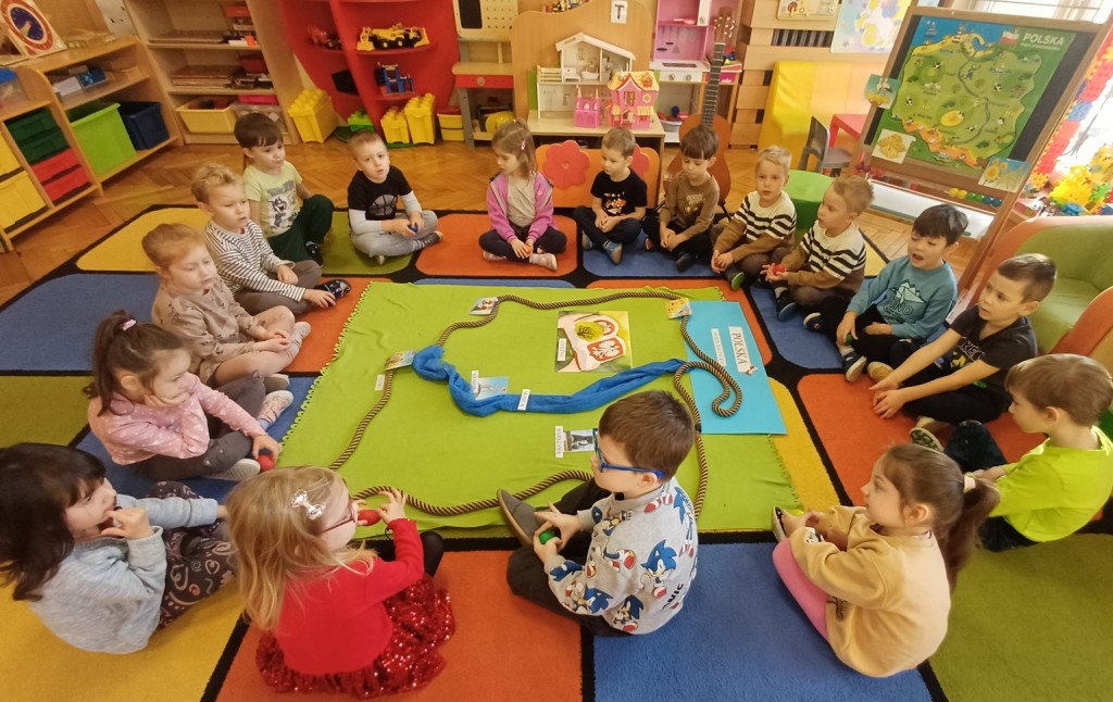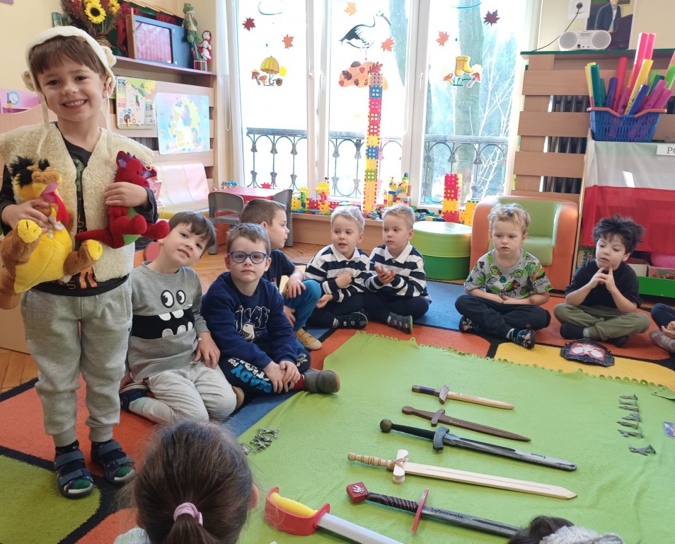 W naszej sali, na dywanie i na tablicy, pojawiły się mapy Polski z niezwykłymi miejscami do odkrywania... Razem z Misiem Uszatkiem pojawiliśmy się w Gnieźnie, gdzie wysłuchaliśmy legendy o Lechu, Czechu i Rusie. Kolejnym przystankiem był Kraków ze słynnym Smokiem Wawelskim i królem Krakiem, a następnego dnia ruszyliśmy do naszej stolicy, której nazwa wzięła się od bohaterów legendy - Warsa i Sawy. Podczas podróży z Uszatkiem spotkaliśmy również Bazyliszka, złego księcia Popiela oraz myszy! Było trochę strasznie, ale daliśmy radę! Dzięki przyniesionym do przedszkola mieczom, koronom, smokom i baraniej skórze mogliśmy zamienić sie w rycerzy, królów, królewny a nawet owieczkę! Polskie legendy bardzo się nam spodobały! Był też czas na biało-czerwone prace plastyczne oraz spacer do miejsca pamięci przy Rondzie Gliwickim.
