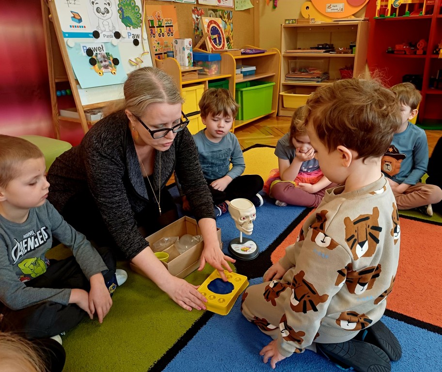 To już kolejne zajęcia grupy Piesków z Panią Pedagog! Tym razem Pani Sylwia przyniosła nam bardzo ciekawą, interaktywną książkę oraz model ludzkiej czaszki ALBIKA! Dzieci słuchały i opowiadały do czego potrzebujemy mózgu i jak możemy o niego dbać. Wybierały również wśród wielu przedmiotów, te które służą naszemu mózgowi i te które szkodzą, np. nadmiar cukru i korzystanie przez dzieci z telefonów czy tabletów. Wiemy już, że dla prawidłowej pracy mózgu potrzebne jest zdrowe odżywianie, sen i odpoczynek, gry planszowe, zagadki logiczne oraz ruch na świeżym powietrzu!