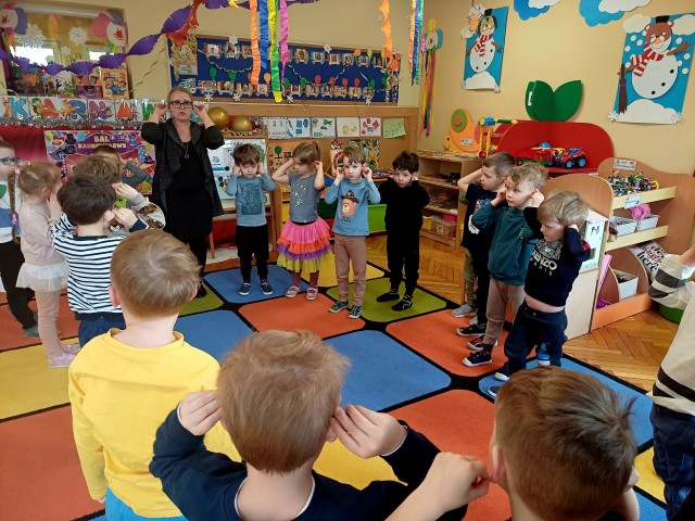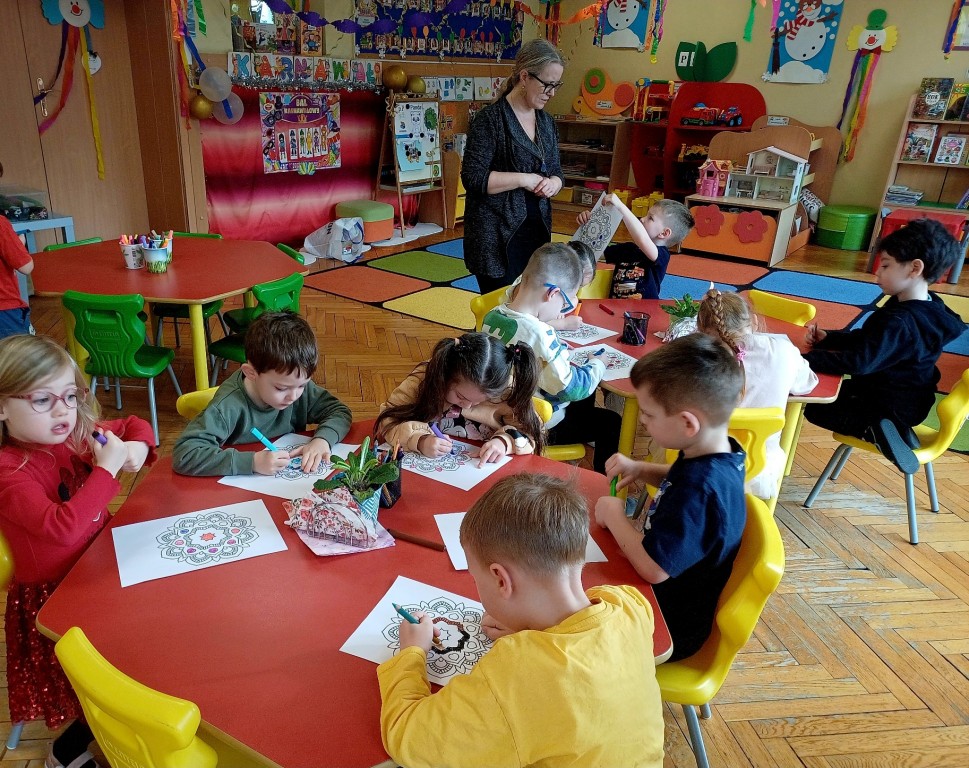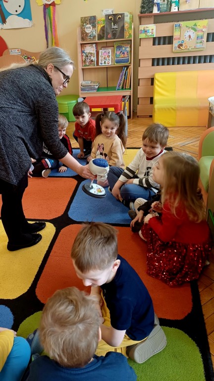 Pani Sylwia opowiedziała nam również o dwóch półkulach, które odpowiadają za mowę i różne umiejętności oraz za to czy dzieci są praworęczne czy leworęczne. Natomiast Mikołaj mógł z masy plastycznej uformować kształt mózgu i umieścić go w czaszce Albika! Dzieci z zainteresowaniem oglądały jak to wygląda, co nam się mieści w głowie...To było bardzo ciekawe! Ale najbardziej podobała się nam gimnastyka dla mózgu (ruchy naprzemienne i synchroniczne) oraz kolorowanie pięknych mandali (nowymi mazakami!!!).