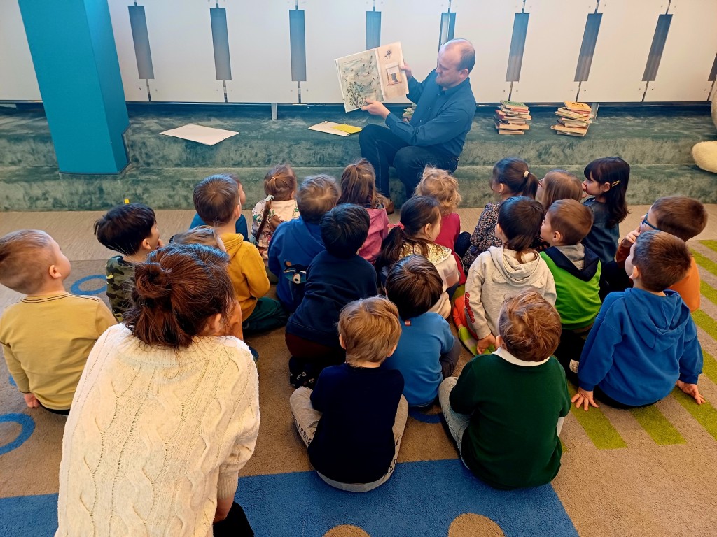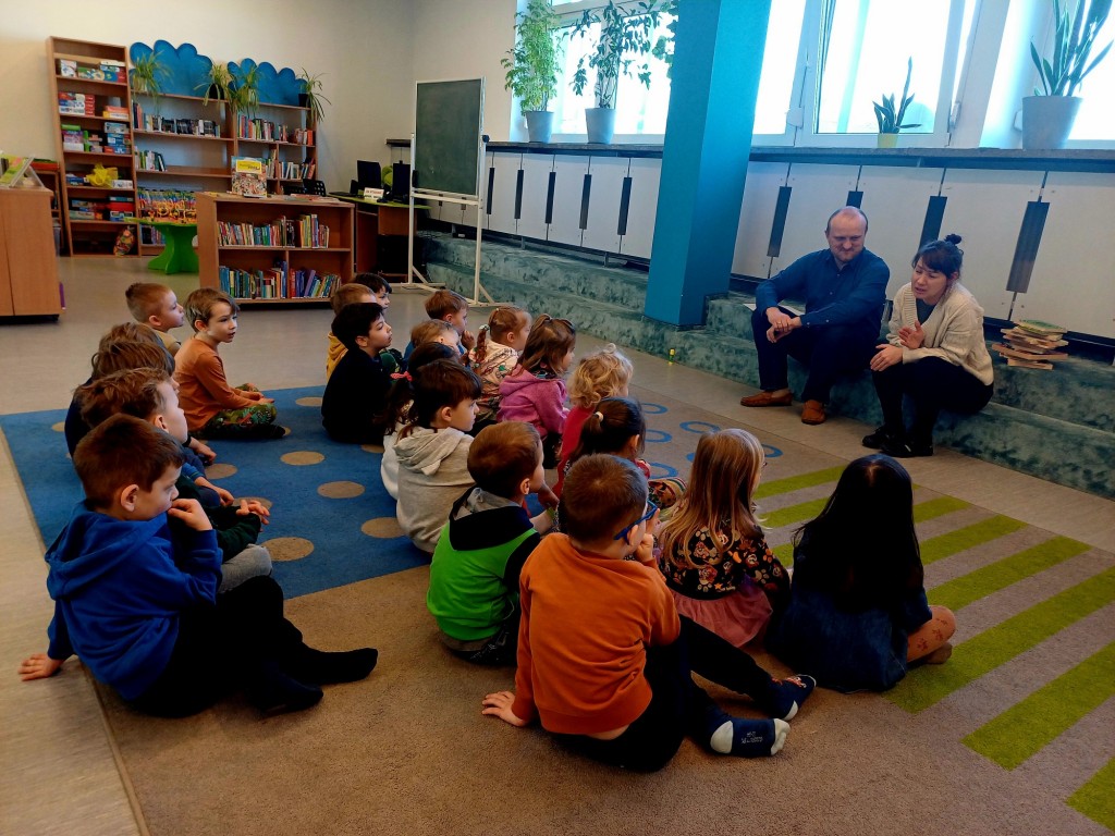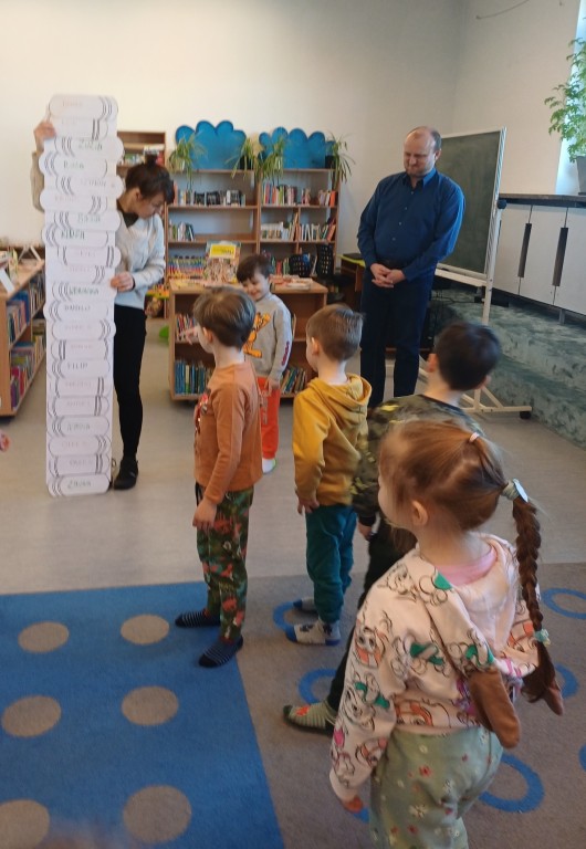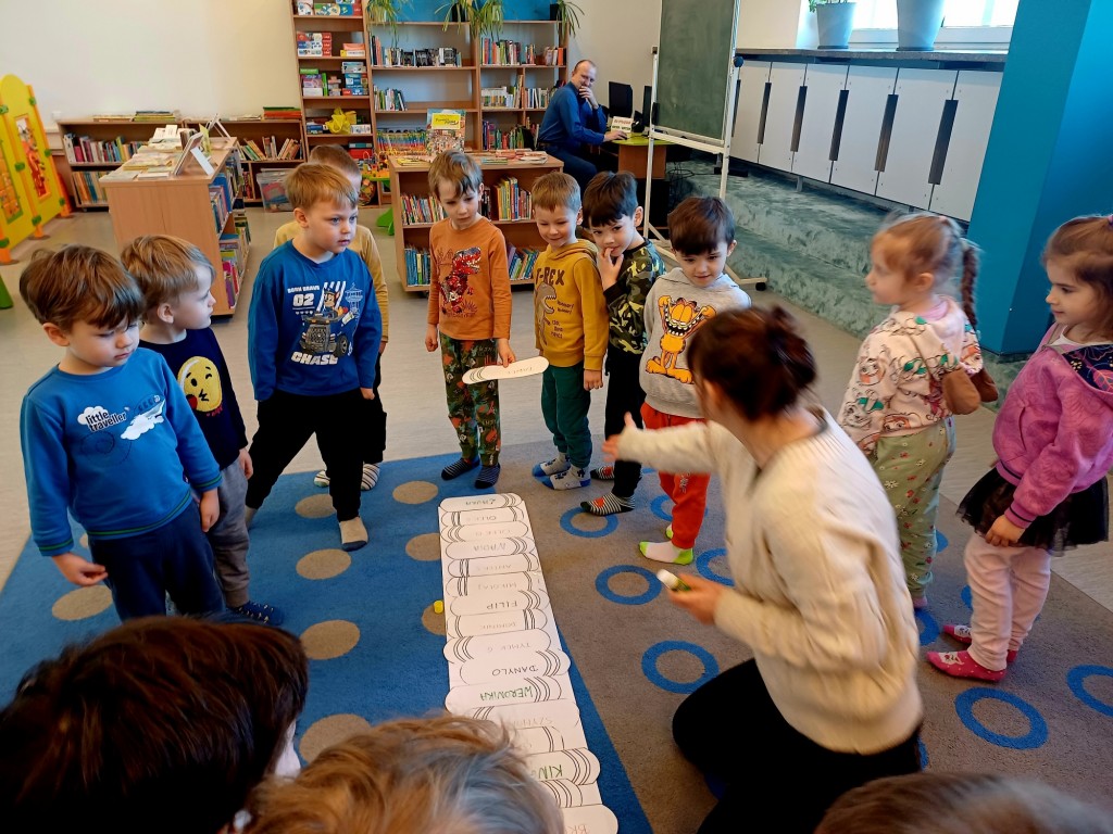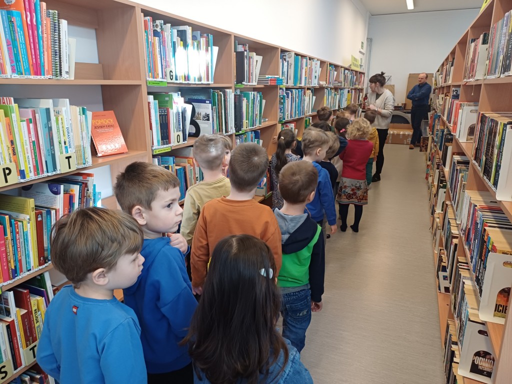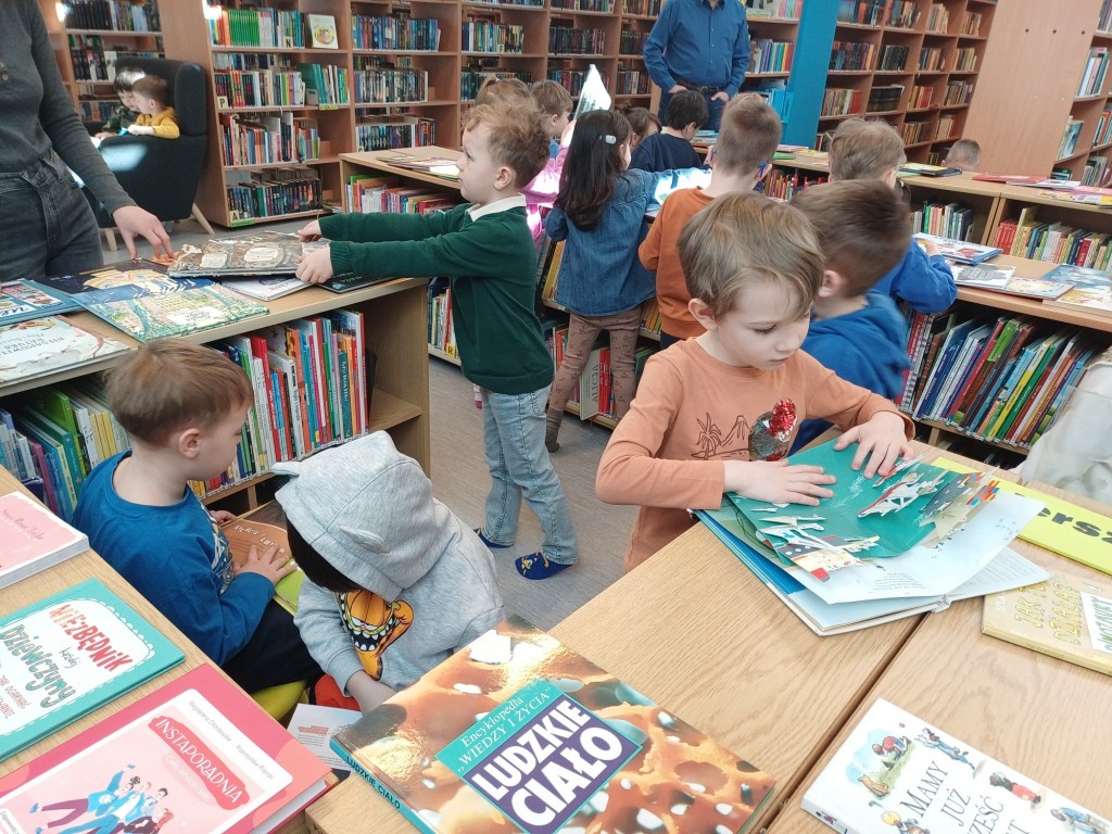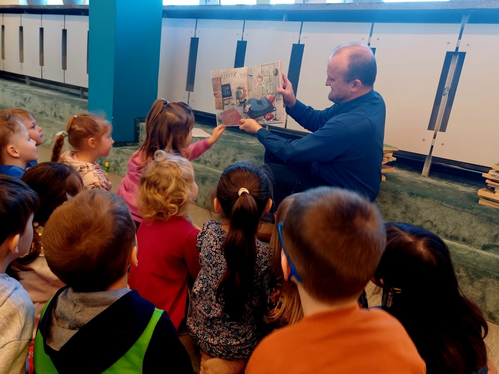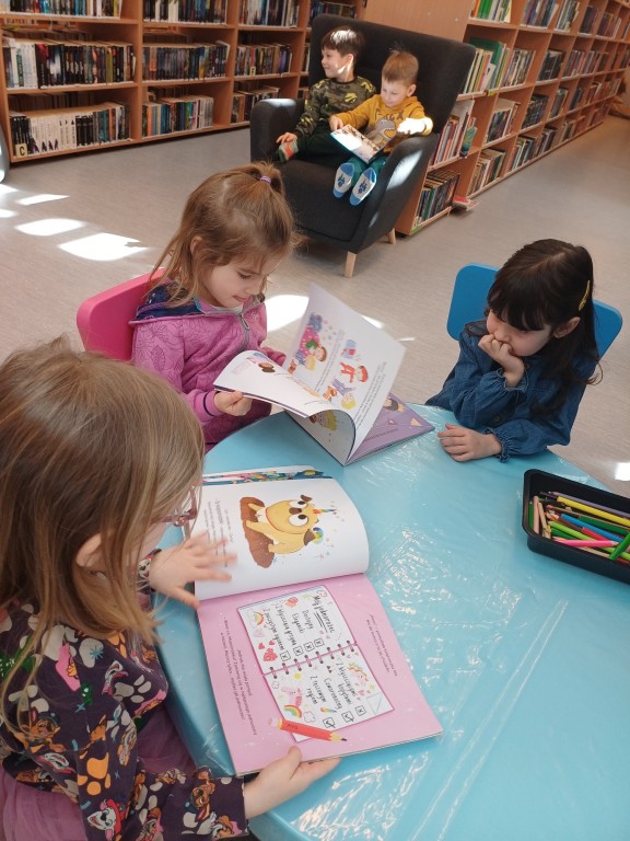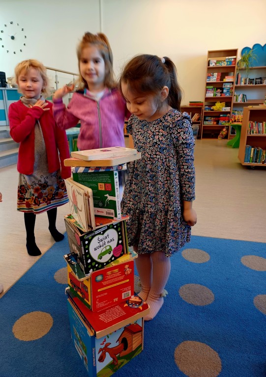 To była wspaniała wizyta - wysłuchaliśmy opowiadania, bawiliśmy się przy muzyce, układaliśmy w grupach wieże z książek i projektowalismy okładakę dla własnej książki. Był też czas na zwiedzanie biblioteki z przewodnikiem - Panią Bibliotekarką - oraz na samodzielne szukanie i oglądanie interesujących książek. Było super! Na pewno przyjdziemy tu znowu!