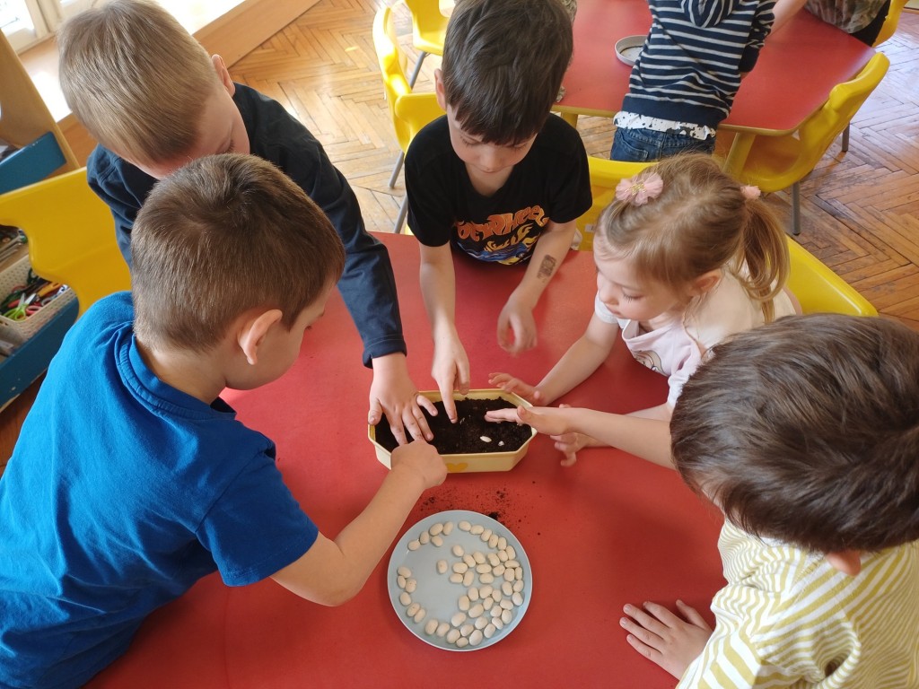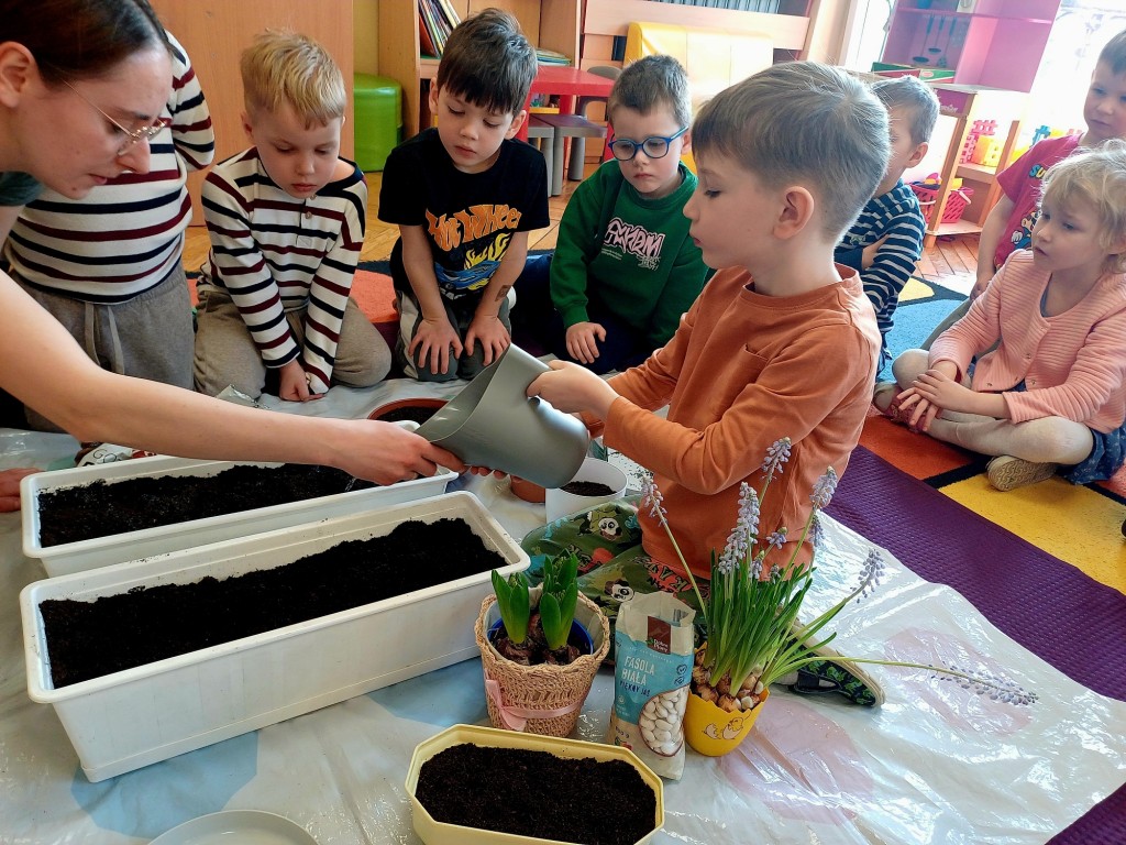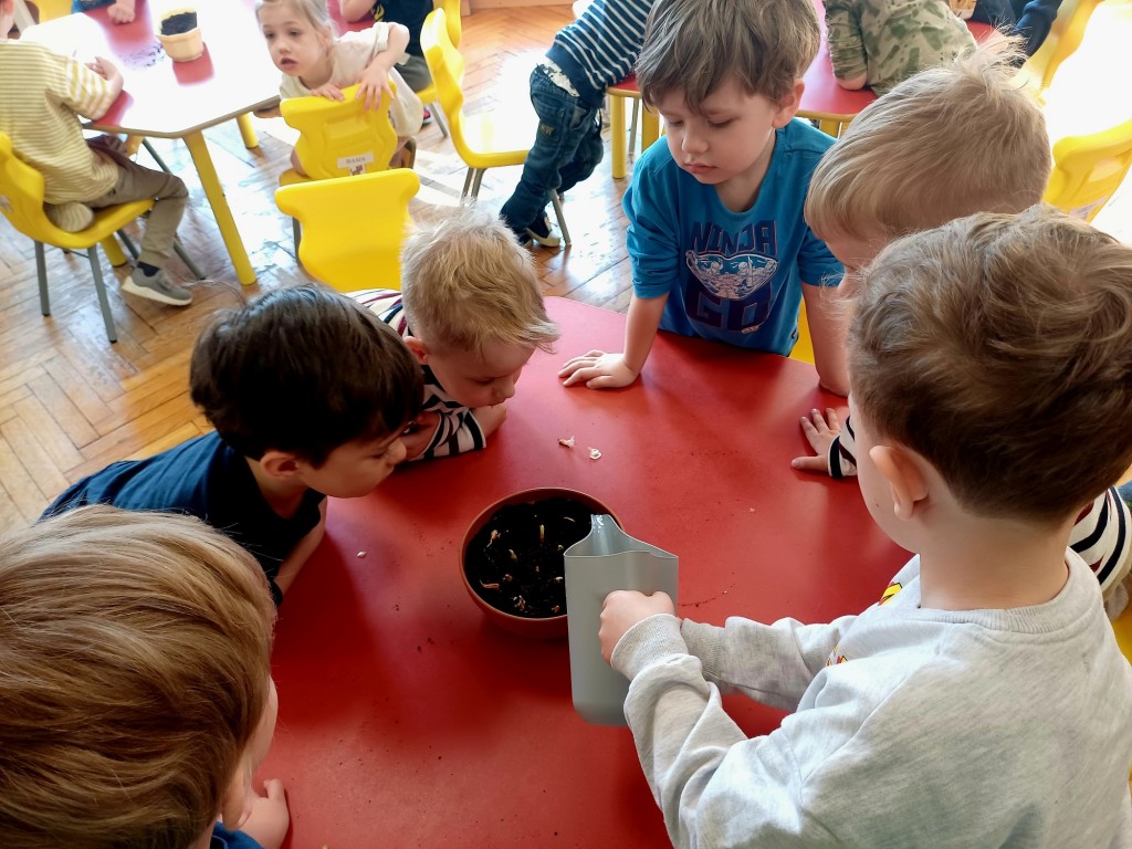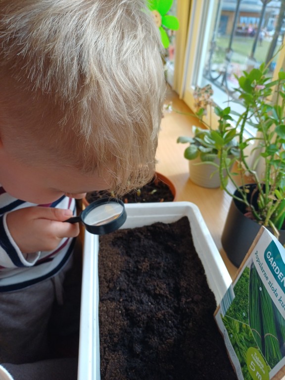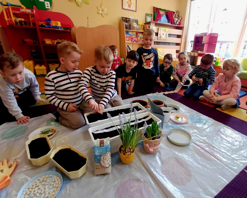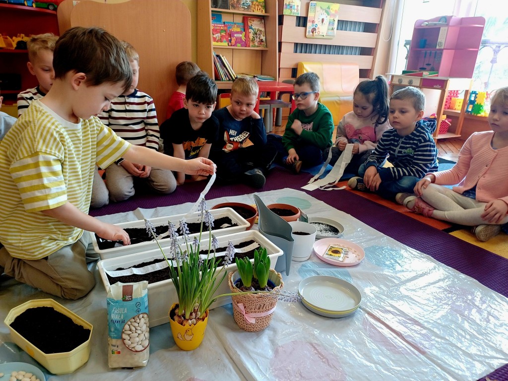 Jak co roku na początku marca zaplanowaliśmy sadzenie i sianie nasion roślin w naszej sali. Dodatkowym impulsem była tematyka witamin, które ukrywają się między innymi w warzywach i dlatego w tym roku w głównej roli wystąpiły nasiona marchewki i pietruszki - tym razem na taśmie nasiennej! Po któtkiej instrukcji i pokazie Pieski przystąpiły do działania. Wykopały rowek w ziemi, następnie odmierzyły długość taśmy, by potem zasypać ją ziemią i w końcu podlać. Tym sposobem posialiśmy marchewkę, pietruszkę i bazylię! Następnie w zespołach stoliczkowych dzieci posadziły do doniczek cebulkę dymkę, fasolę, szczypiorek, słonecznik i owies. Największą frajdę sprawiło jak zwykle podlewanie. Ostatecznie doniczki przenieśliśmy na parapet okna aby miały dostep do światła słonecznego i przygotowaliśmy lupy do obserwacji.