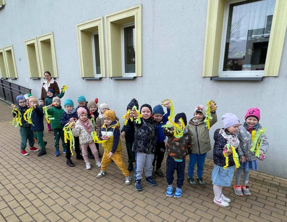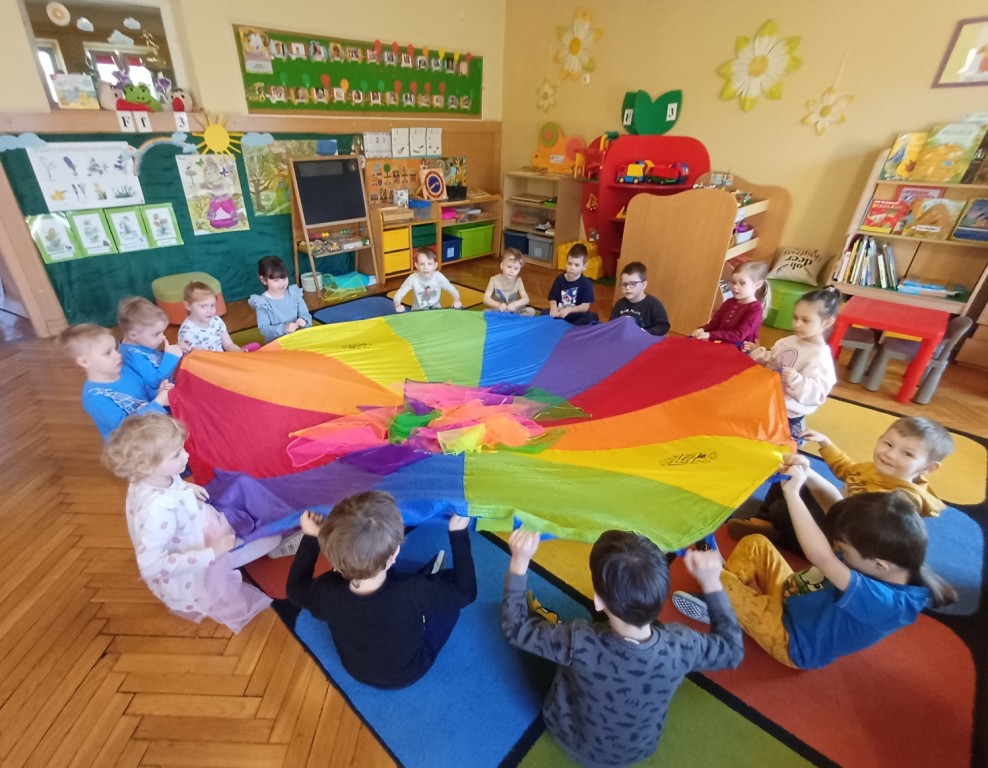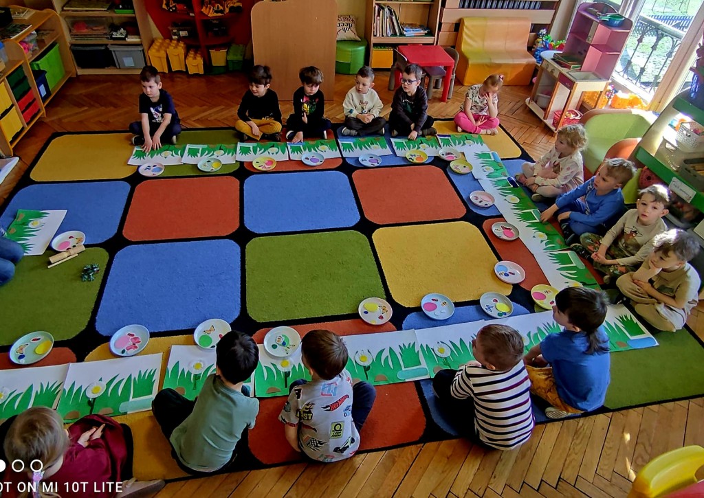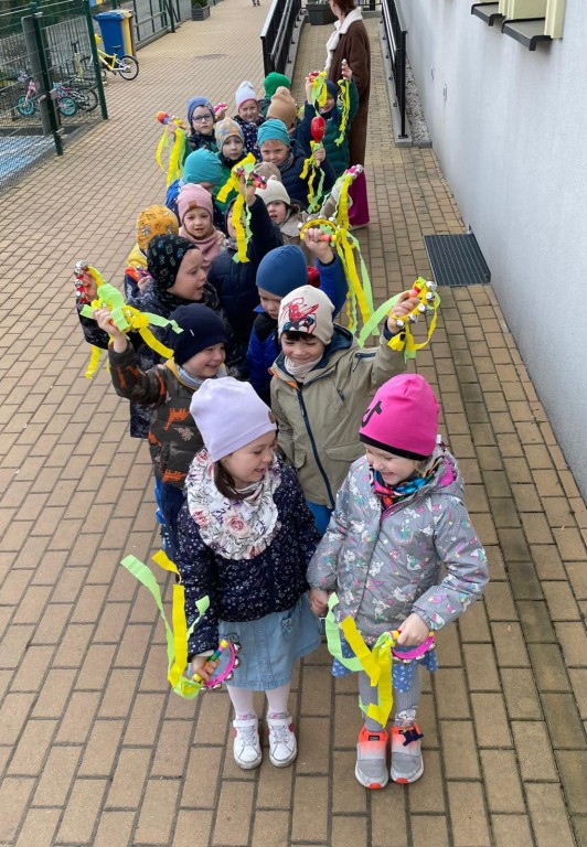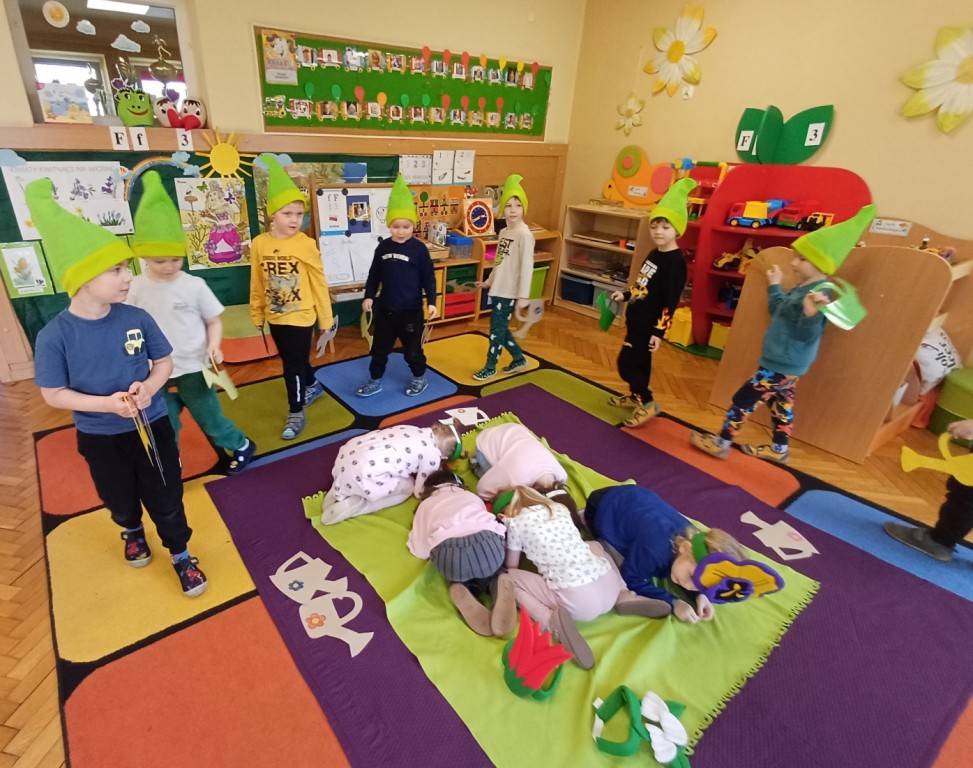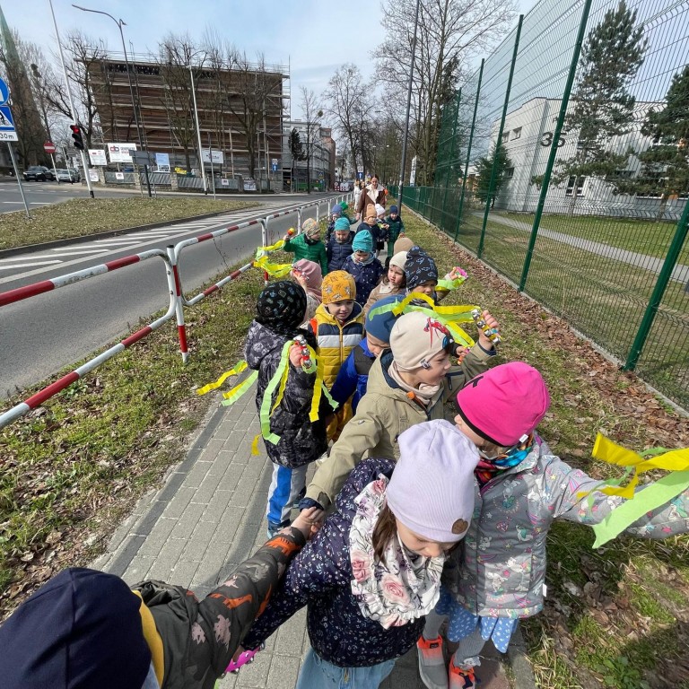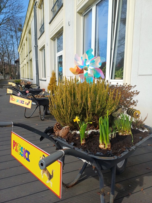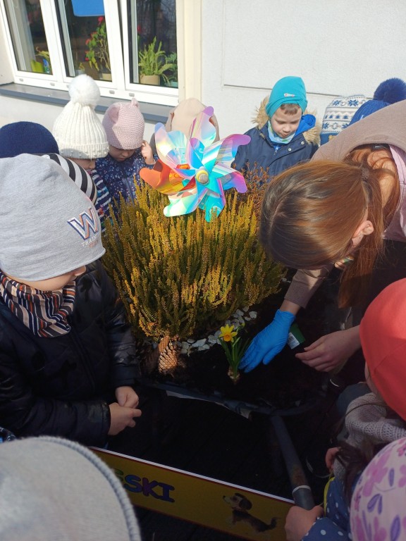 W tym roku marzec jest wyjątkowo piękny i słoneczny. Można więc było już na początku miesiąca zrobić wiosenne porządki w naszej taczce po zimie i zasadzić przyniesione przez dzieci żonkile, szafirki, krokusy, hiacynty oraz pierwiosnki. Z rozpoznawaniem kwiatów radzimy sobie już całkiem dobrze - gramy w kwiatowe memory oraz nazywamy kwiaty na wiosennych opaskach podczas róznych zabaw muzyczno - ruchowych. Piękne kolory wiosny zachęcają nas do różnych zabaw, również z chustą animacyjną i chusteczkami, które tworzą prawdziwą tęczę w naszej sali! Na zajęciach plastycznych malowaliśmy gałązki forsycji a na zajęciach matematycznych liczyliśmy pierwsze owady na łące. Natomiast w przeddzień nadejścia kalendarzowej wiosny wraz z całym przedszkolem poszliśmy głośnym i barwnym korowodem aby wszystkim ogłosić jej nadejście!
