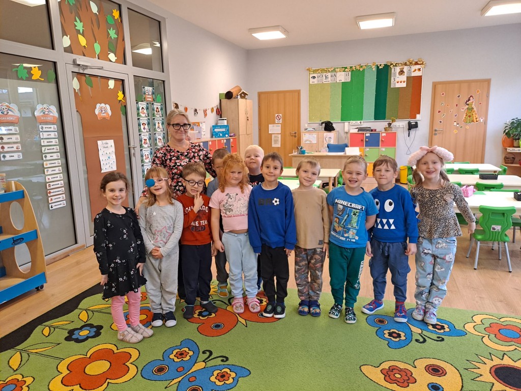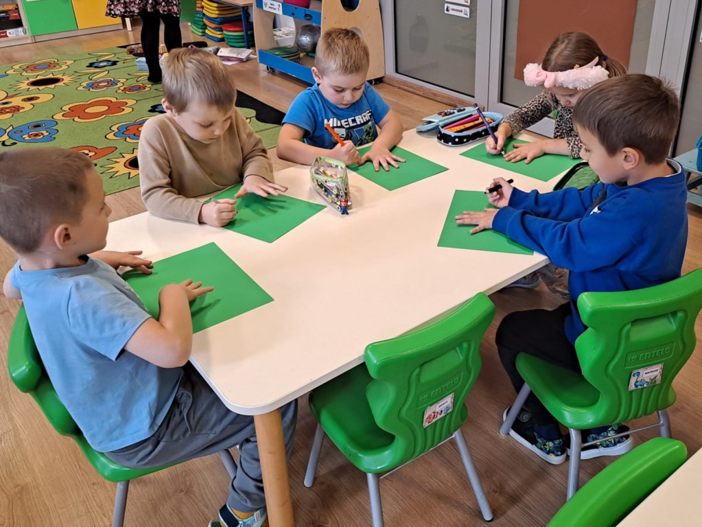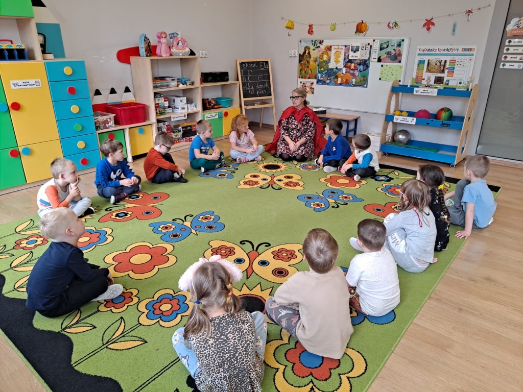 Dzisiaj naszą grupę odwiedziła Pani pedagog specjalny, która przeprowadziła krótkie zajęcia z projektu pt. "STOP przemocy". Ubrana w pelerynę superbohatera, opowiedziała dzieciom o tym, jak dbać o dobre relacje z innymi i jak z nimi współpracować. Dzieci oglądały ilustracje, przedstawiające dobre i złe zachowania, a później wypowiadały się o nich na forum grupy. Pani pedagog wytłumaczyła, że każdy z nas może zostać superbohaterem, jeśli traktuje innych z szacunkiem, życzliwością i zrozumieniem. Na koniec dzieci odrysowały swoje dłonie na kartkach i narysowały w nich osoby, przy których czują się bezpiecznie.