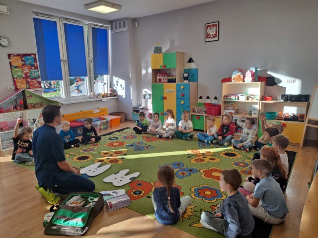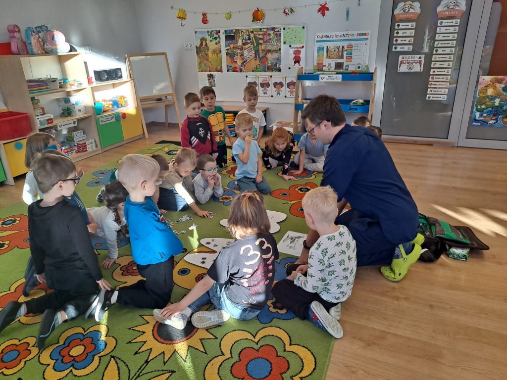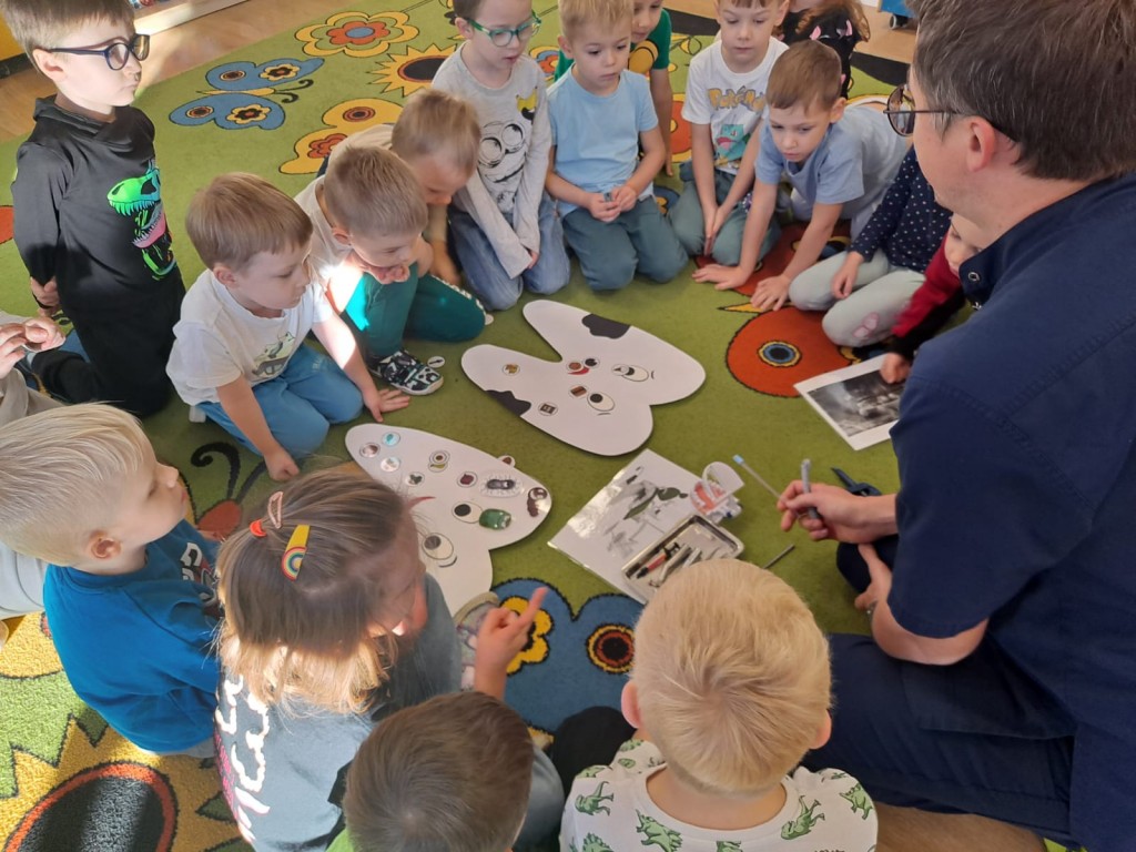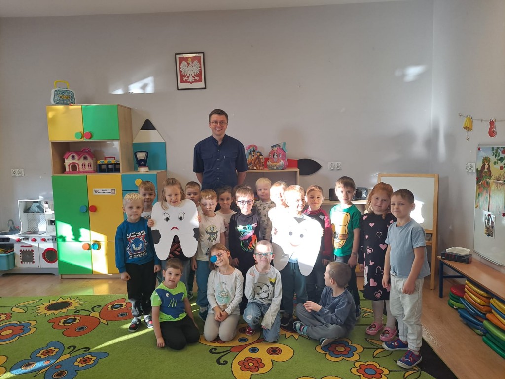 Dziś w naszym przedszkolu odbyło się spotkanie z dentystą. Z dużym zainteresowaniem wysłuchaliśmy pogadanki na temat dbania o nasze zęby. Wiemy już, co to jest próchnica, jakie produkty szkodzą naszym zębom i jak prawidłowo je myć. Pan Daniel pokazał nam też narzędzia, których używa w swojej pracy. Na koniec otrzymaliśmy szczoteczki i bawiliśmy się w czyszczenie ząbków z bakterii.