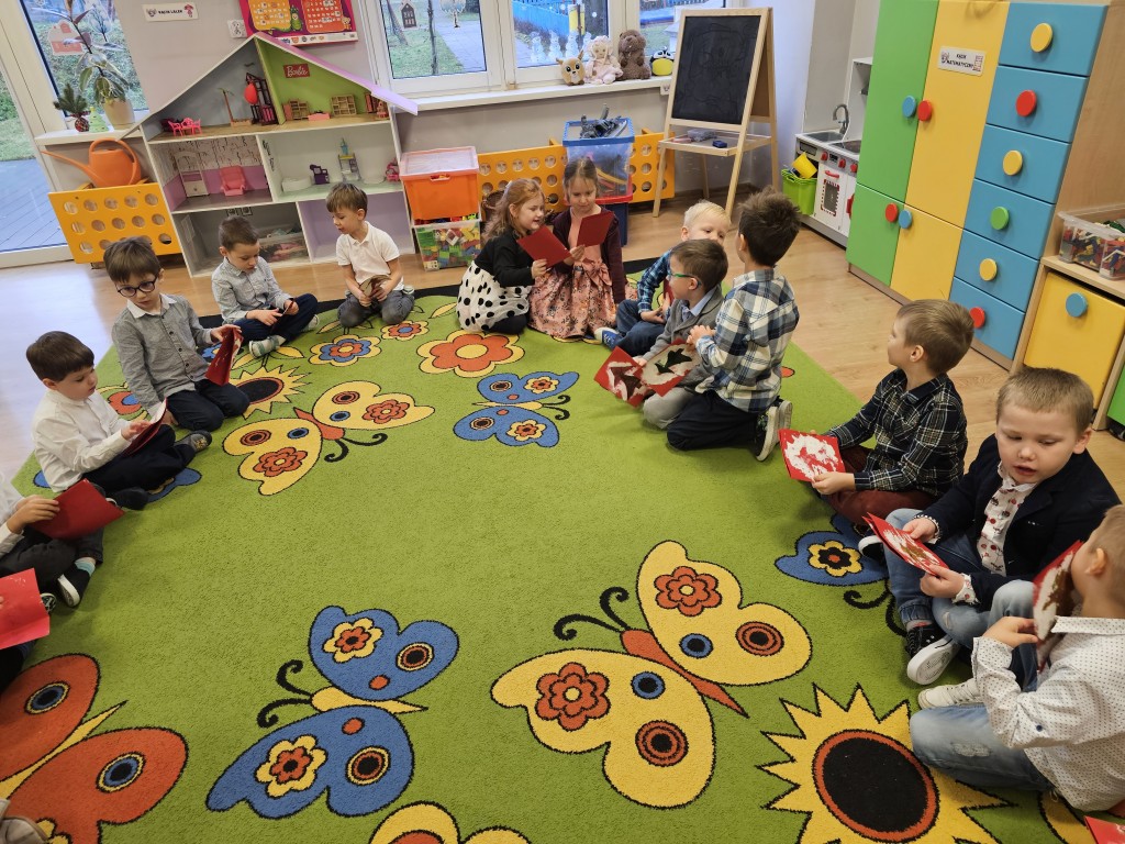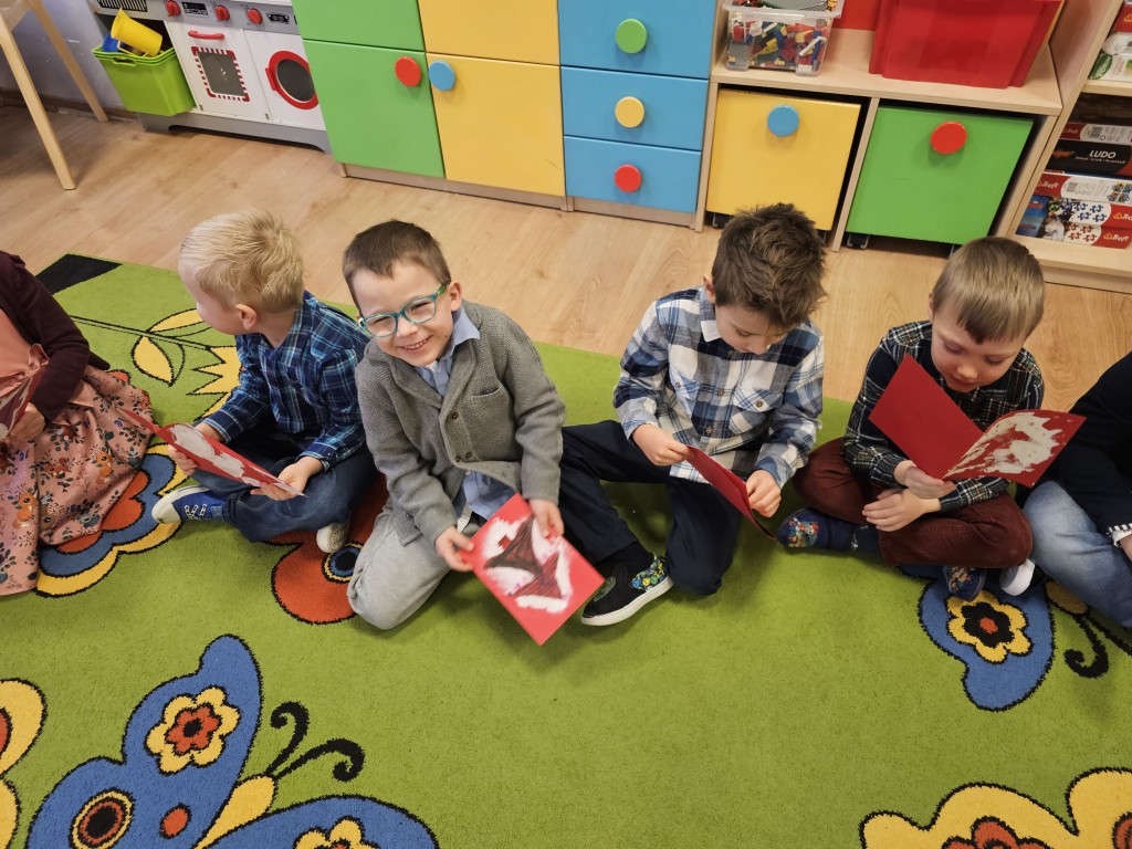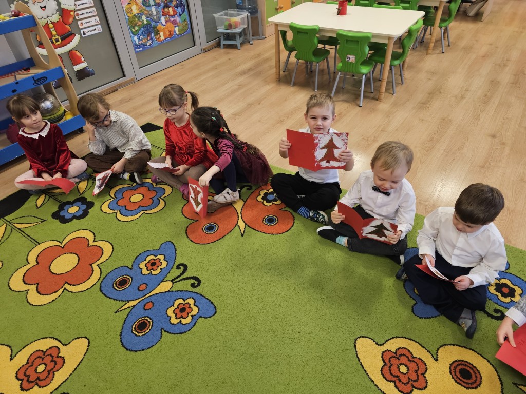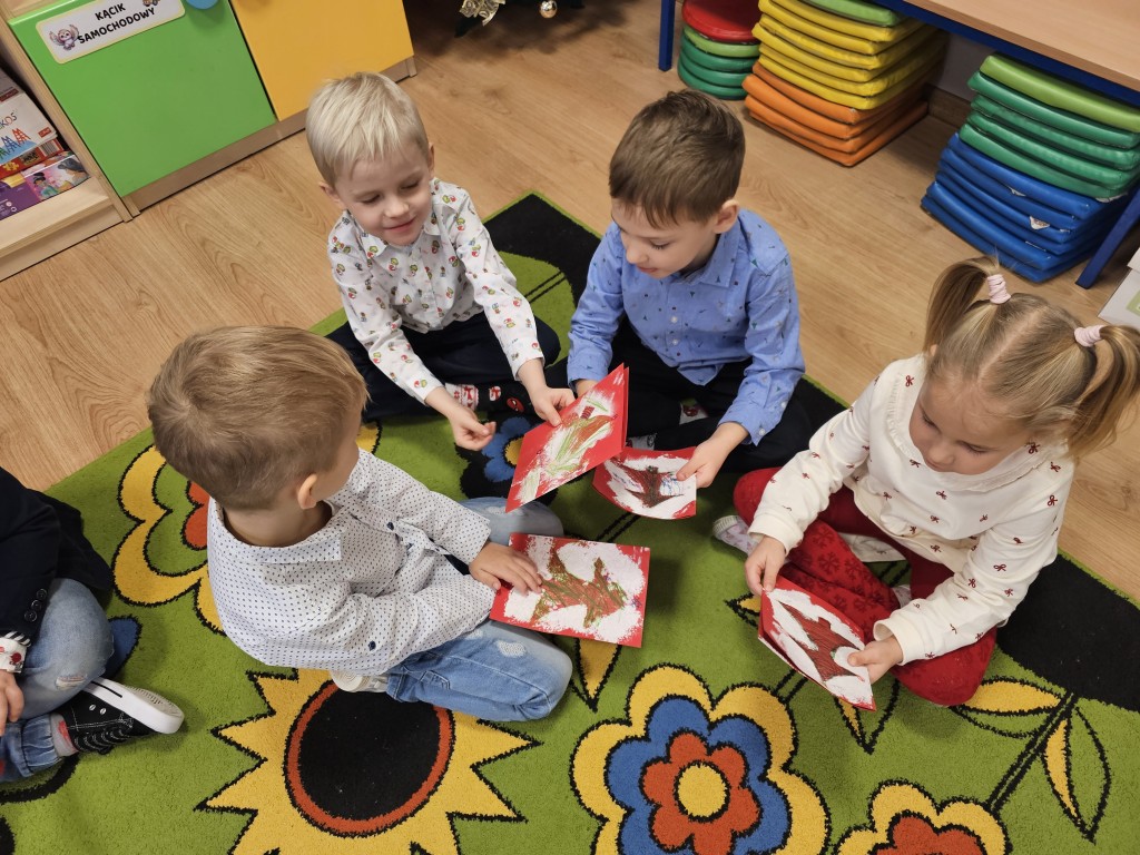 Przed świętami, w ramach współpracy z przedszkolem w Katowicach, wysłaliśmy do grupy Króliczków samodzielnie przez nas zrobione kartki świąteczne. Wykonanie ich sprawiło nam dużo radości. Jeszcze więcej uśmiechów na naszych twarzach wywołały kartki świąteczne zrobione przez koleżanki i kolegów z Katowic. Bardzo dziękujemy i życzymy Wesołych Świąt!