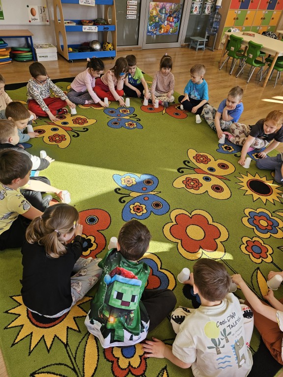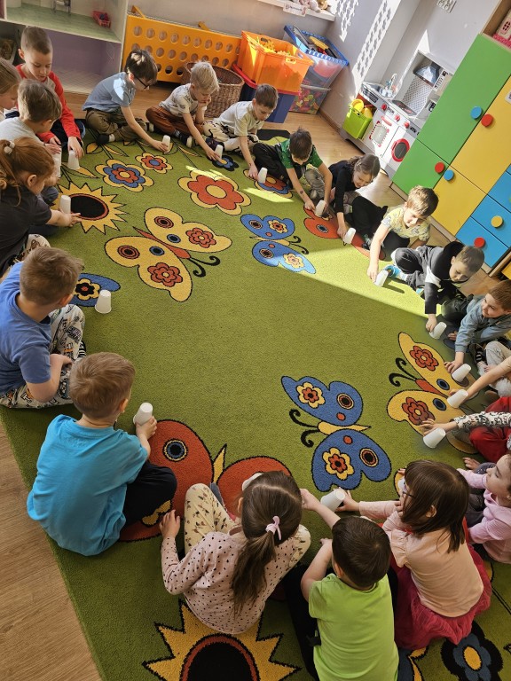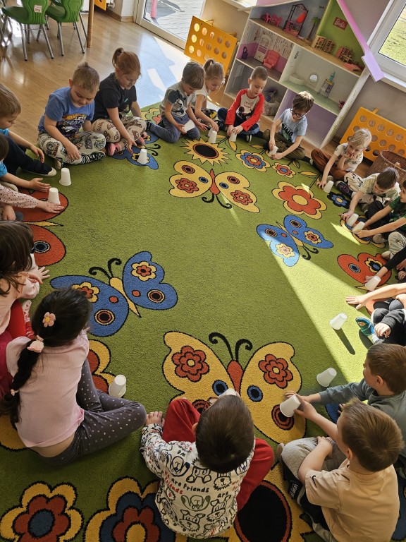 Wspólnie szukaliśmy sposobów na poradzenie sobie z zazdrością, a potem pobawiliśmy się razem. Do zabaw wykorzystaliśmy kubeczki, a w jednym z nich ukryty był złoty guzik Pana Zielonka.