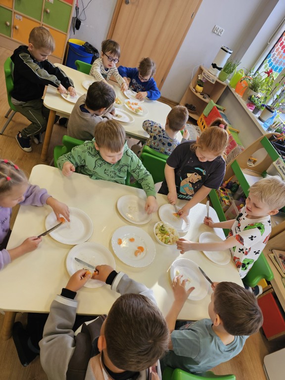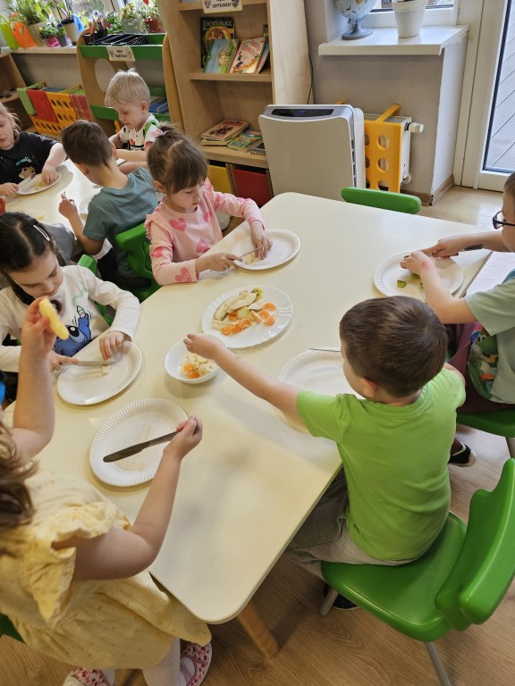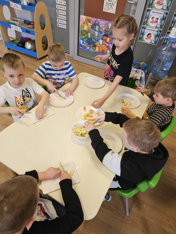 W tym tygodniu realizowaliśmy blok tematyczny "Witaminki dla chłopczyka i dziewczynki". Wzbogaciliśmy naszą wiedzę na temat dbania o własne zdrowie - przypomnieliśmy sobie piramidę zdrowego żywienia i wiemy, które aktywności mają pozytywny wpływ na funkcjonowanie naszego organizmu. W czwartek odbył się Turniej wiedzy o zdrowiu, w którym nasza grupa rywalizowała z grupą Sroczek oraz Kogucików. W piątek zrobiliśmy zdrowy sok oraz sałatkę owocową, co było naprawdę pysznym podsumowaniem całego tygodnia :)