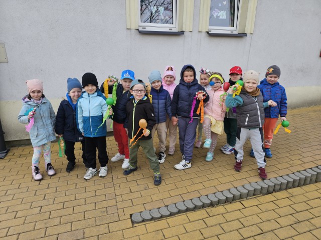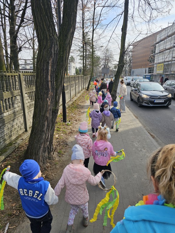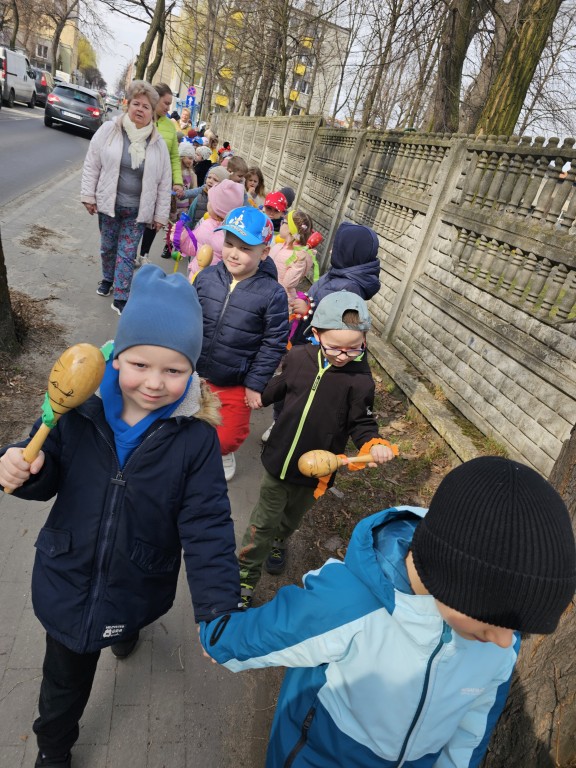 W ostatni piątek wesoło powitaliśmy nową porę roku. Zabraliśmy ze sobą instrumenty, którym dodaliśmy trochę kolorów, a następnie wszyscy razem wybraliśmy się na wiosenny korowód po okolicy przedszkola.