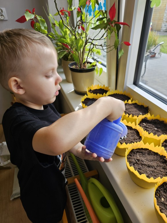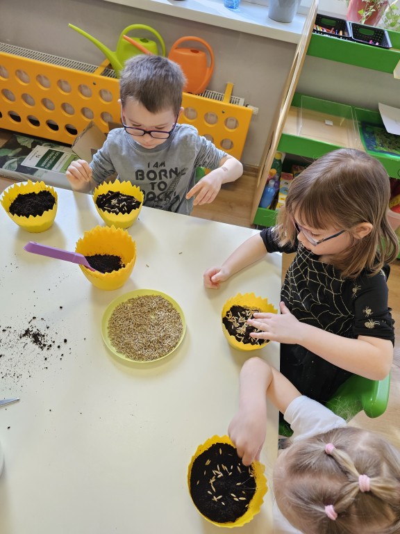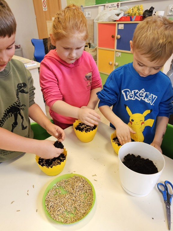 A jak wiosna, to i prace w ogrodzie. Posadziliśmy nowe rośliny w naszej grupowej taczce, a z okazji zbliżającego się kiermaszu wielkanocnego posialiśmy owies. Wiemy też, jak dbać o nasze rośliny i regularnie je podlewamy :)