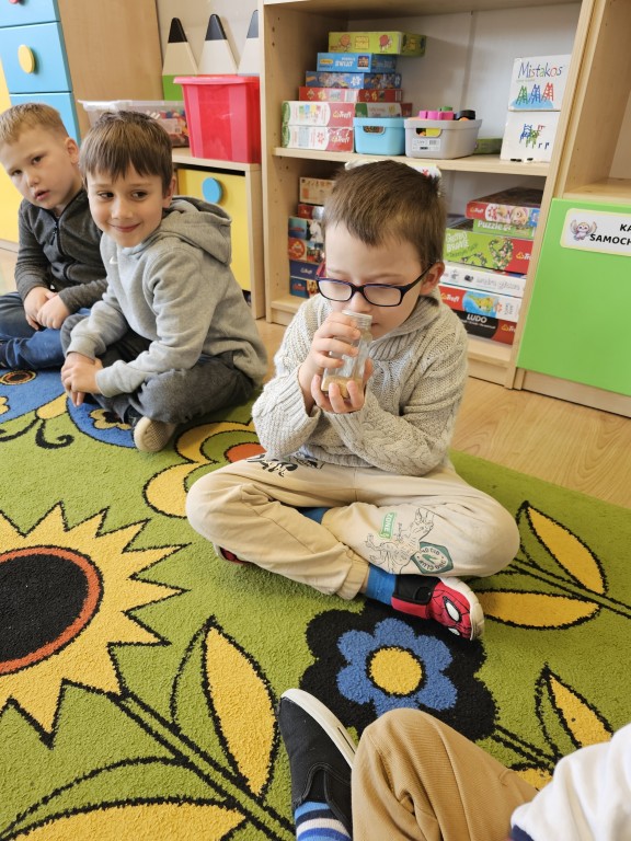 Wczoraj wykonaliśmy kolejne zadanie z projektu "Czuciaki" i poznaliśmy kolejnego stwora - Pana Ble z Wyspy Wstrętu. Tym razem wysłuchaliśmy historii o Filipie, który nie znosił zapachu ryby i cebuli. Dowiedzieliśmy się czym jest wstręt i jak można minimalizować nieprzyjemne odczucia, np. otworzyć okno i przewietrzyć pomieszczenie. Opowiadaliśmy o tym, jakie rzeczy wzbudzają w nas obrzydzenie i rozwiązywaliśmy zagadki zapachowe. Na koniec pobawiliśmy się wspólnie w "Dobre czy ble?".