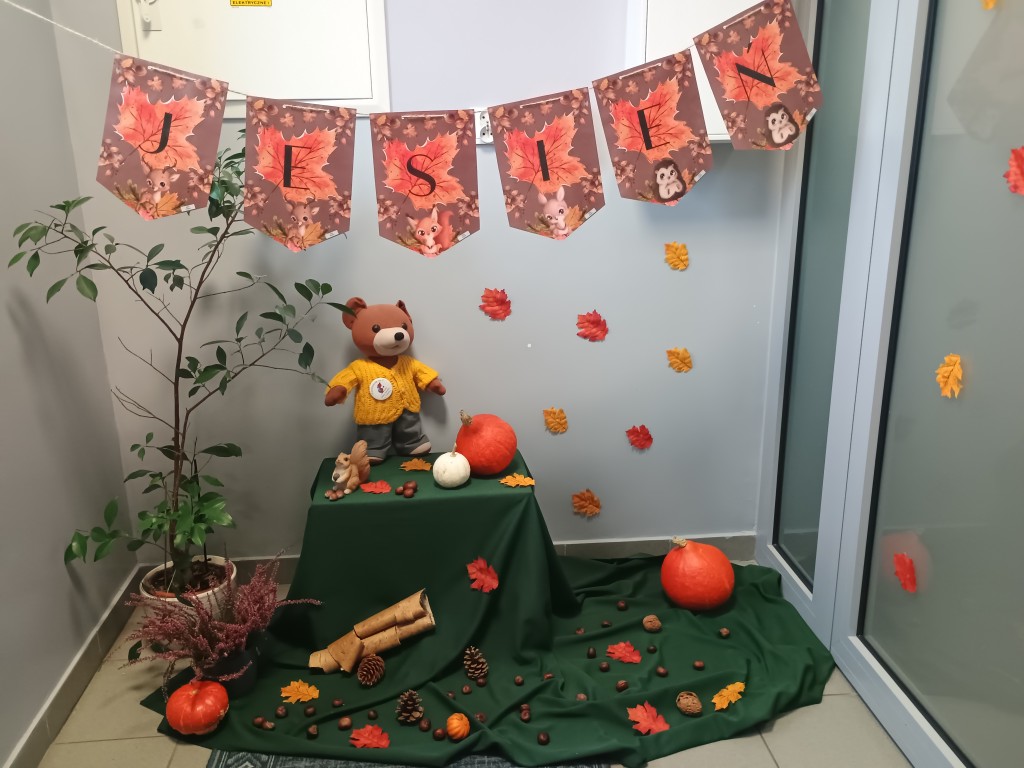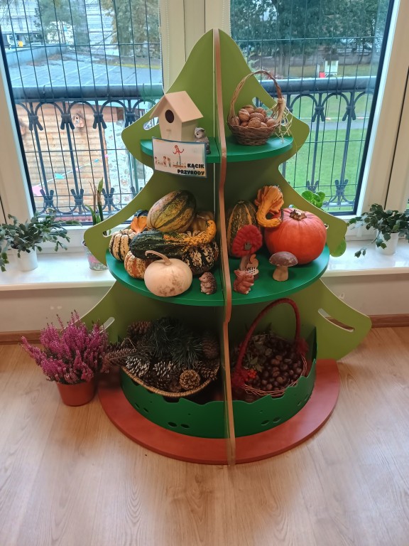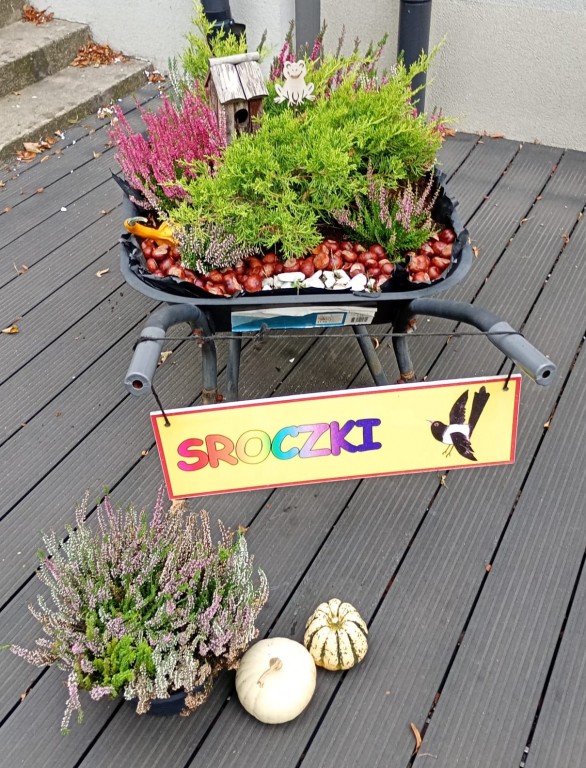 Okazuje się, że jesień króluje nie tylko w sadach czy ogrodach. W naszej sali można ją znaleźć w kąciku przyrody. Wraz z rozpoczęciem jesieni, w naszej grupie trwały działania zmierzające do zaaranżowania ciekawego, bogatego w dary jesieni kącika przyrody. Sroczki podczas jesiennych spacerów z rodzicami zbierały żołędzie, kasztany, jarzębinę, kolorowe liście, szyszki i z wielką radością przyniosły je do przedszkola. Oglądalismy wtedy co kto zebrał, było porównanie, przeliczanie i segregacja darów jesieni. Dzieci przyniesone dary układały starannie w kąciku przyrody. Podkreślić należy, iż kąciki przyrody w przedszkolu dają dzieciom możliwość bezpośredniego kontaktu z przyrodą i są nieustannym źródłem doświadczania, odczuwania i przeżywania. Oczywiście lepiej podglądać jesień na zewnątrz, ale miło jest jednak śpiewać o niej, gdy mamy ją w zasięgu wzroku !!! Wykorzystując piękną jesienną pogodę udaliśmy się na podwórko aby posadzić wrzosy i udekorować naszą taczkę.