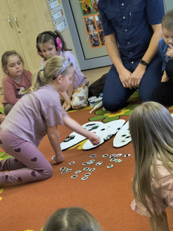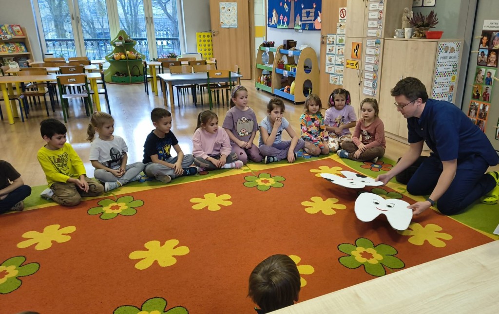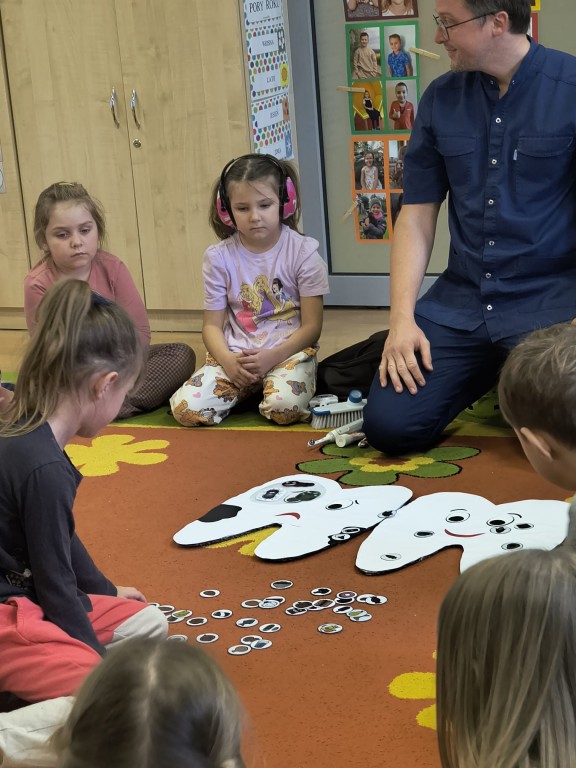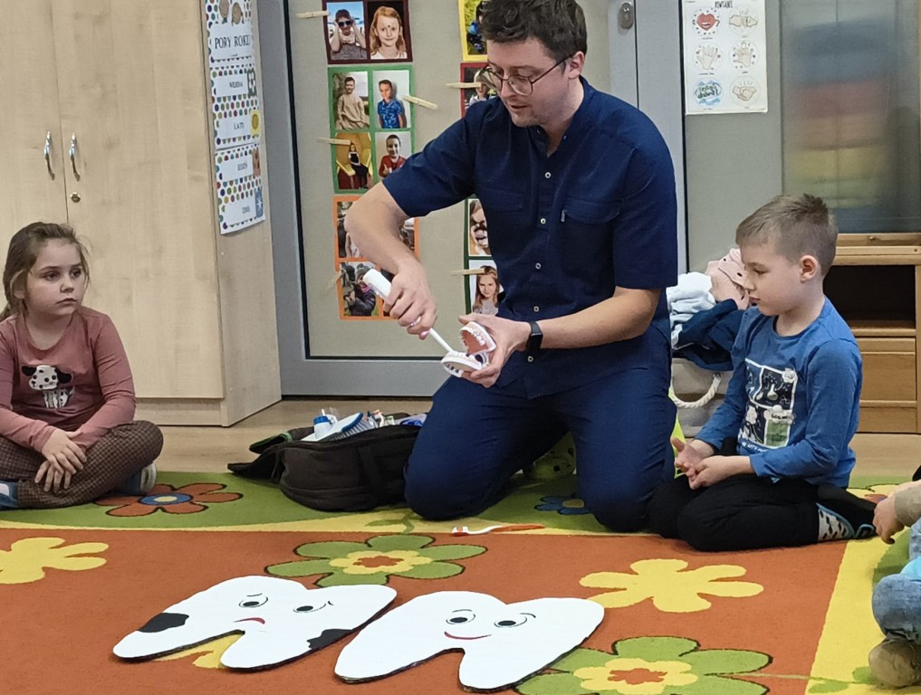 W dniu 20.11.2025 r. naszą grupę, odwiedził pan stomatolog, który w bardzo ciekawy sposób zapoznał przedszkolaki z tematem profilaktyki i higieny jamy ustnej. Przybliżył dzieciom na czym polega zawód dentysty, zmniejszył obawy przed wizytą w gabinecie dentystycznym, a także zachęcał dzieci do kontroli zębów. Dzieci dowiedziały się również w jaki sposób i jak długo prawidłowo czyścić zęby, pan doktor zaciekawił dzieci modelem szczęki, na którym zaprezentował prawidłowe mycie zębów. Wyjaśnił również dzieciom, co to jest próchnica i dlaczego psują się zęby. Przedszkolaki dowiedziały się co należy jeść, aby zęby były zdrowe, a których produktów należy unikać. Wszystkie dzieci z wielkim zaciekawieniem wysłuchały pana doktora i brały aktywny udział w pogadance.
