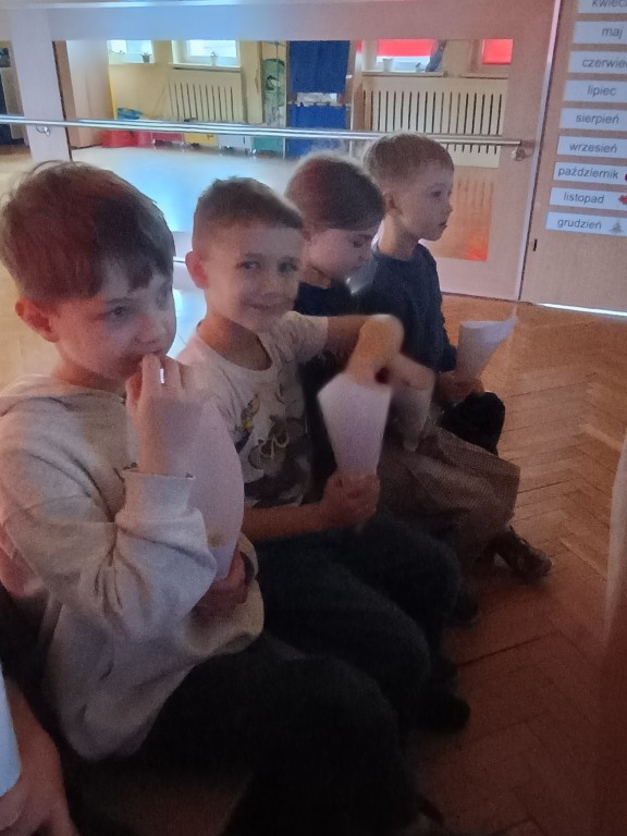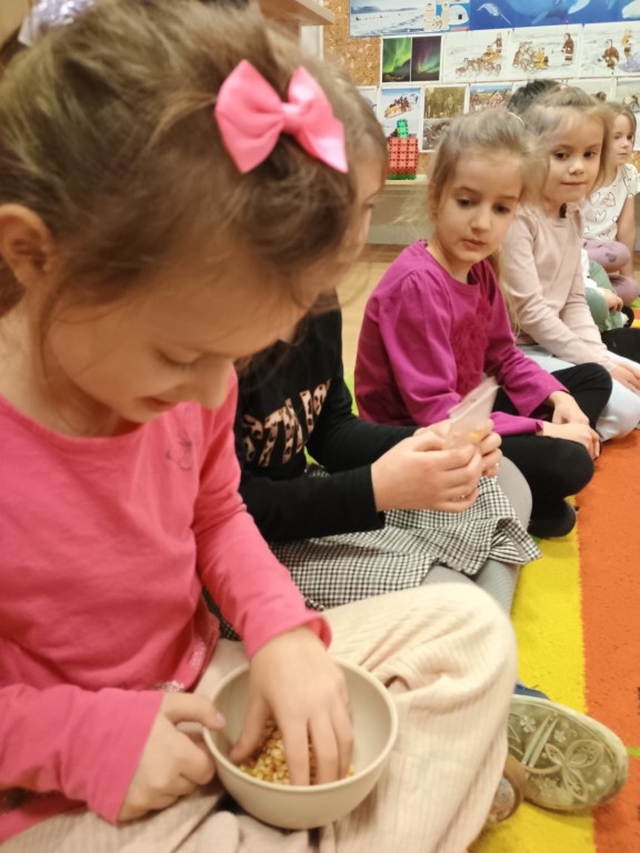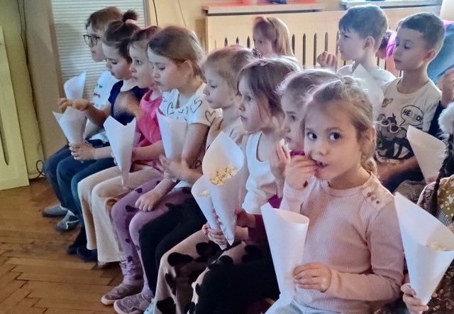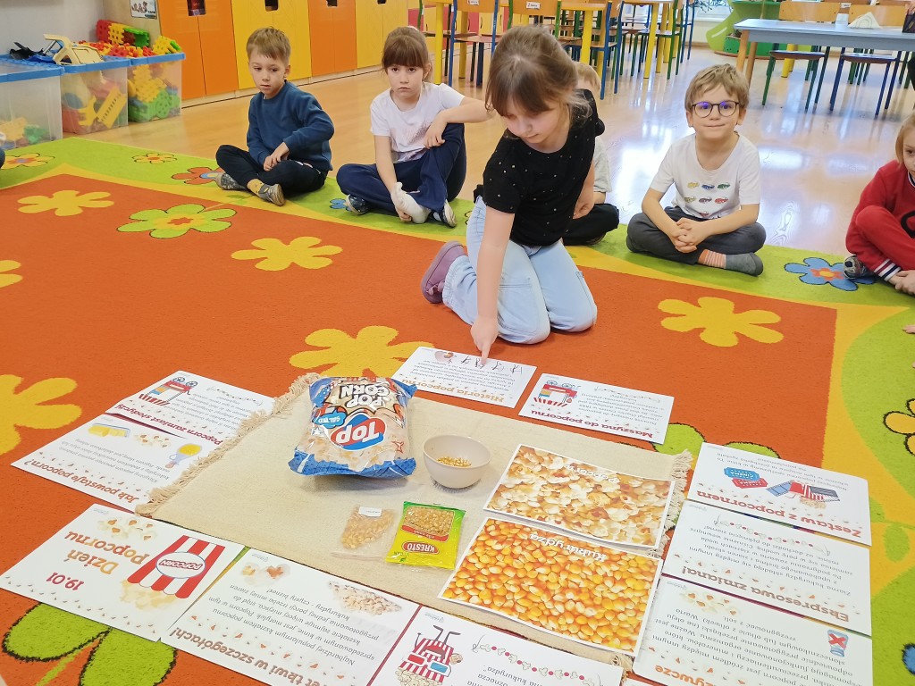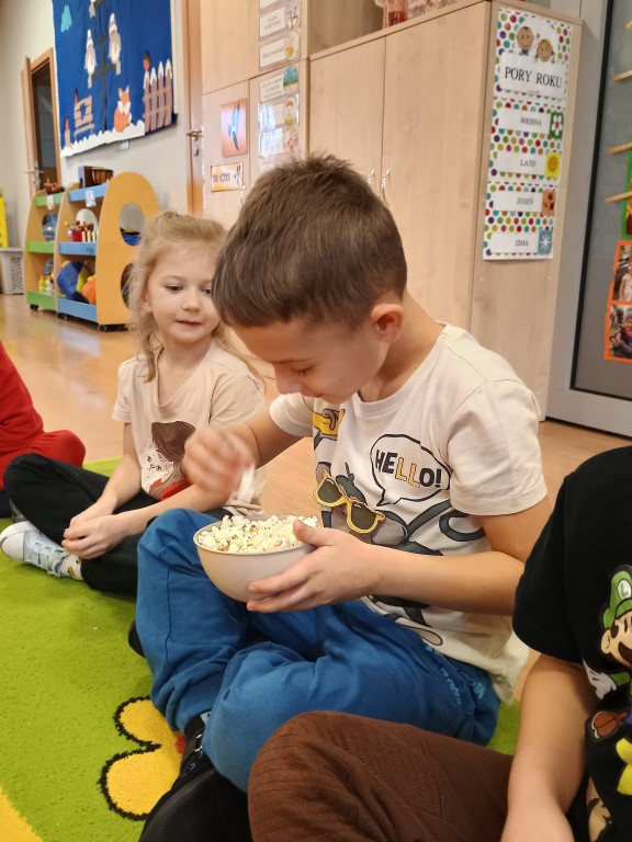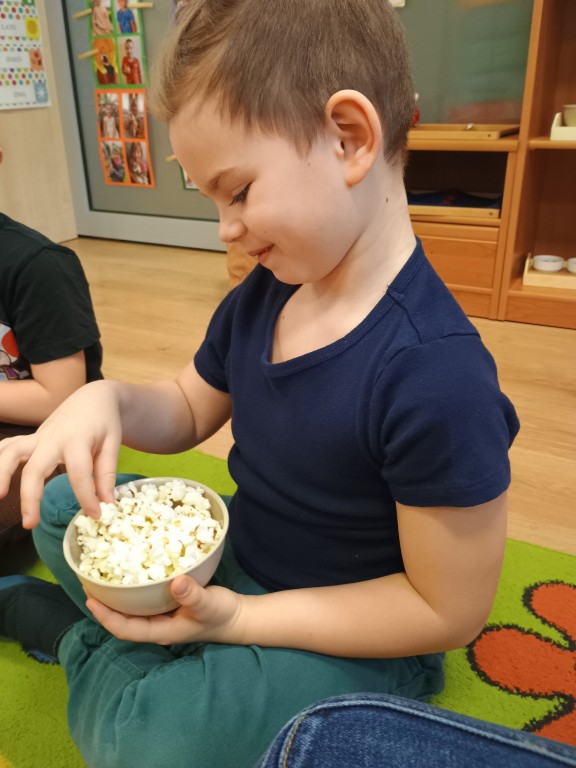 Na początku zajęć poznaliśmy historię powstania pomysłu na jedzenie kukurydzy w tej właśnie formie. Poddaliśmy popcorn dokładnej obserwacji. Zauważyliśmy, że każdy ma inny kształt, który może przypominać dosłownie wszystko. Dzieci opisały jego smak i zapach. Każdy przedszkolak miał przygotowany własny pojemnik na popcorn, a podczas wspólnej zabawy rozwiązywaliśmy zadania matematyczne z popcornem, ćwicząc liczenie i logiczne myślenie. Na koniec mogliśmy zajadać się pyszną przekąską i oglądać bajkę. Przedszkolaki mogły poczuć się jak w prawdziwym kinie.