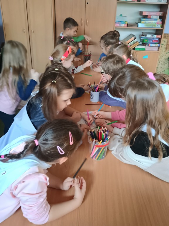 Przedszkolaki z wielką radością zapoznały się z magicznym dla nich miejscem. Była to pierwsza wizyta wśród tylu książek. Z tematem spotkania zapoznała Sroczki Pani z Biblioteki szkolnej, która opowiadała dzieciom o tym magicznym miejscu, z wielkim zainteresowaniem przedszkolaki oglądały książki znajdujące się na półkach, ale szczególnie zainteresował ich dział dla najmłodszych. Dzieci dowiedziały się, co należy zrobić, aby stać się czytelnikiem biblioteki oraz jak należy się w niej zachować. W trakcie pobytu w bibliotece, wysłuchały opowiadania o kredkach, a potem dzieci wykonały plakat z kredkami w roli głównej.