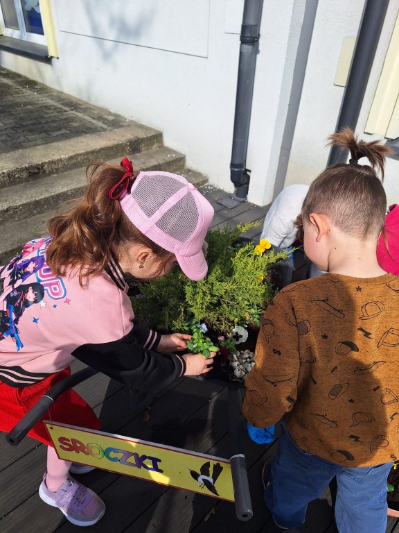 Sroczki zaangażowały się w sadzenie wiosennych kwiatów w grupowej taczce przed budynkiem przedszkola.
