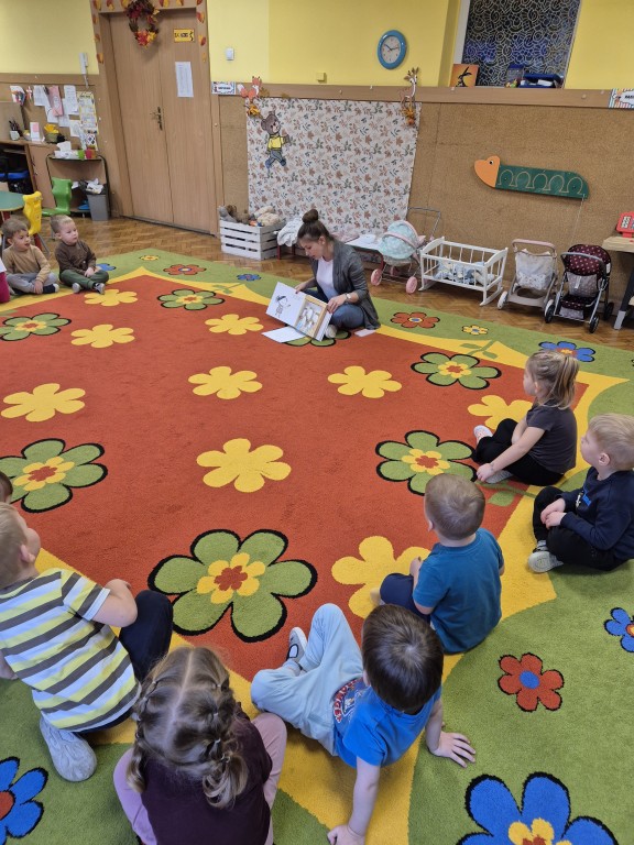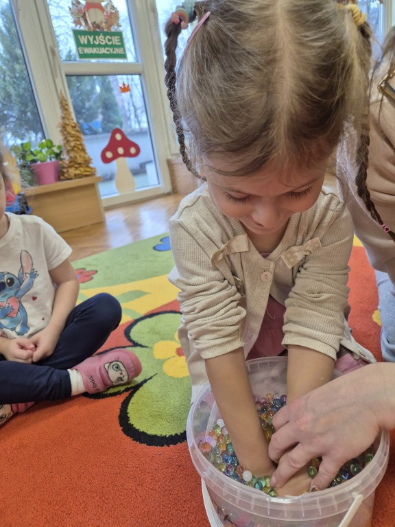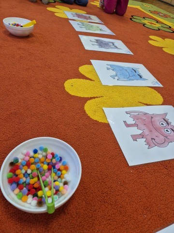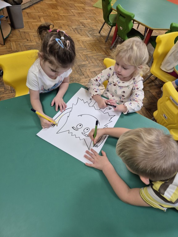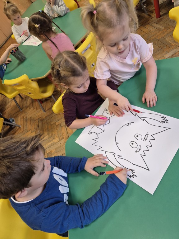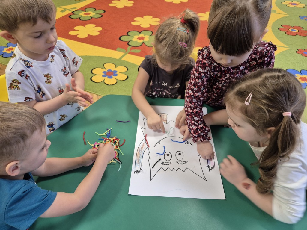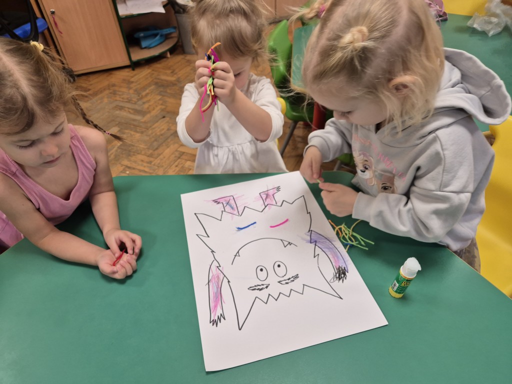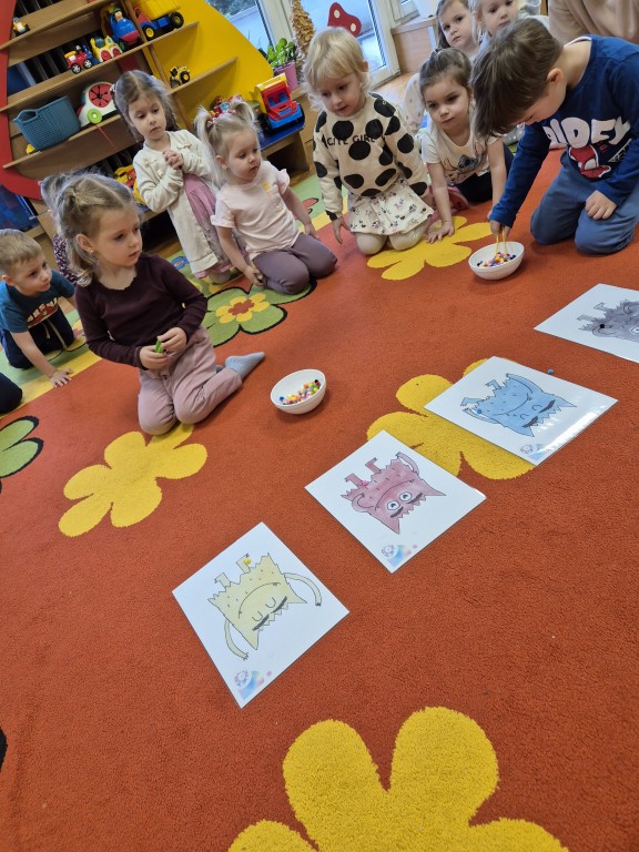 Słuchaliśmy i oglądaliśmy pięknie zilustrowaną bajkę o kolorowych potworach oraz ich emocjach. Kolory oraz wyrazy twarzy potworków pomógł nam określić co czują. Następnie przypasowaliśmy kolorowe pomponiki do odpowiedniego potworka. Mieliśmy też okazję zanurzyć dłonie w kulkach sensorycznych. Było to ciekawe doświadczenie. Na koniec pracujac w grupach pokolorowaliśmy potworki oraz wyklejaliśmy je kawałkami włóczki.