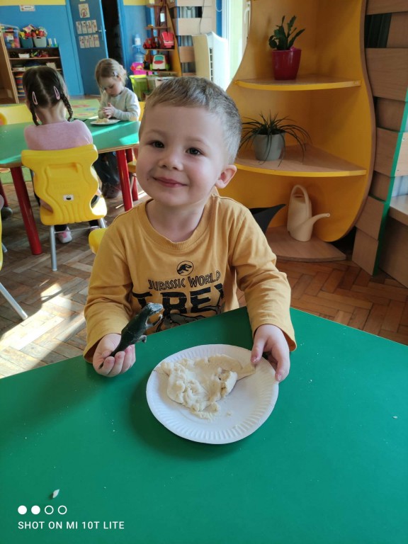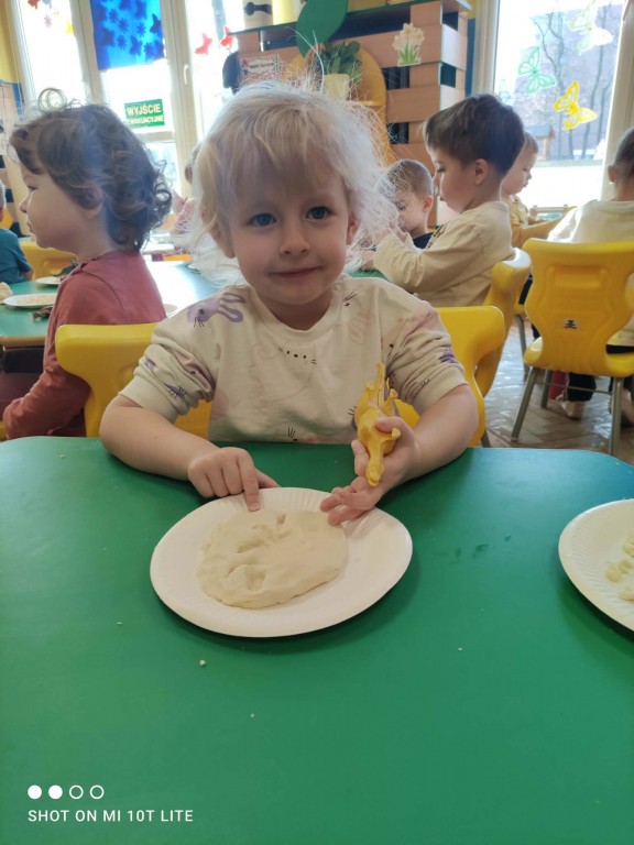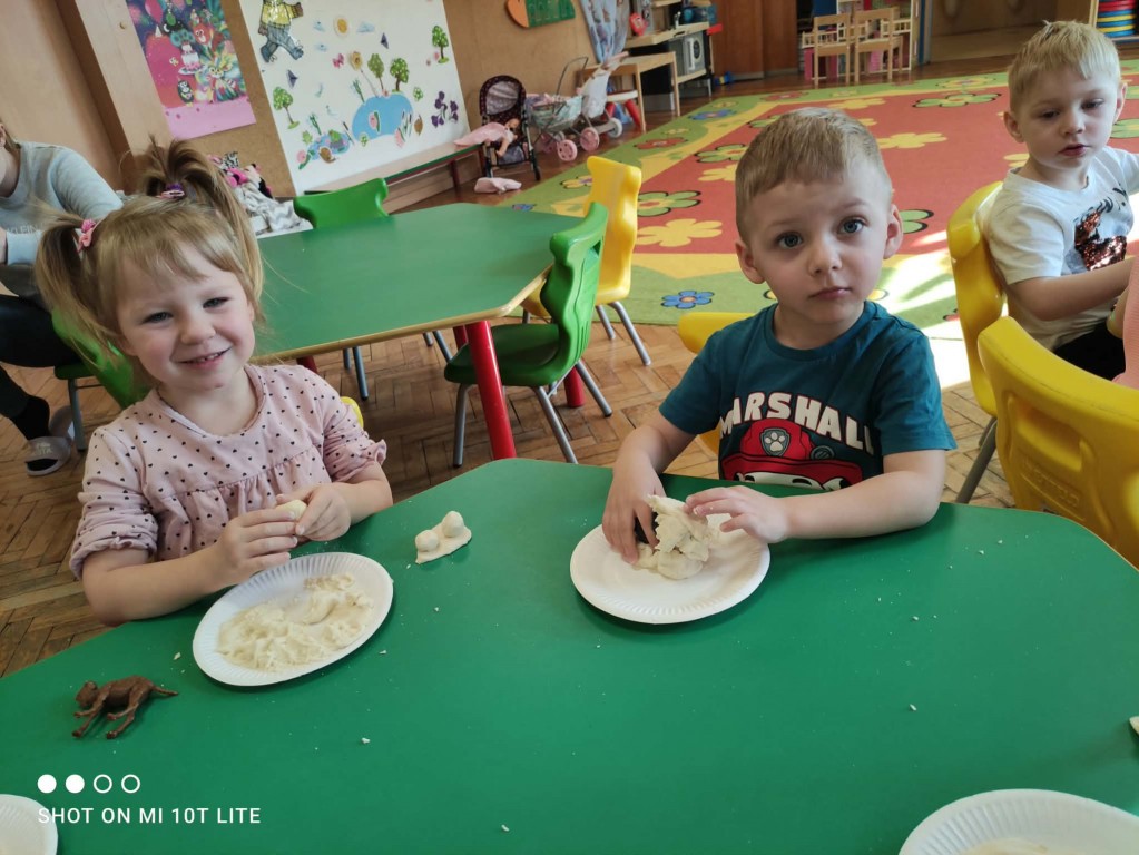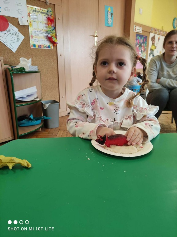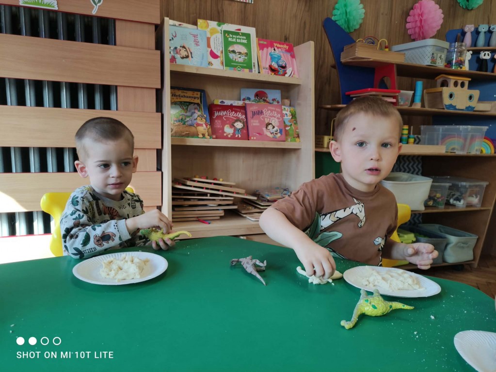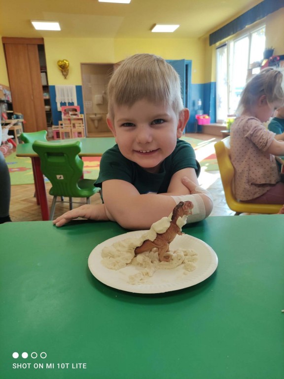 Dla dzieci był to tydzień świetnej zabawy, uśmiechu oraz odkrywczych doświadczeń, ponieważ przenieśliśmy się do fascynującego świata dinozaurów.Czas upłynął nam na wspólnej zabawie, poznawaniu ciekawostek o dinozaurach oraz rozwijaniu wyobraźni. Dzieci chętnie uczestniczyły w zajęciach, a szczególną atrakcją była zabawa z masą solną, podczas której powstały „skamieliny”.